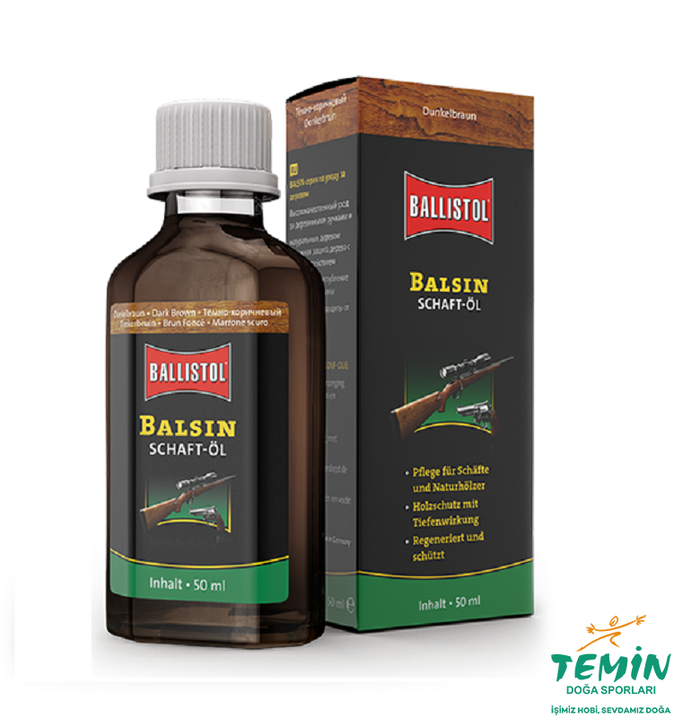 Ballistol Balsin koyu kahverengi kundak yağı; ceviz kundak başta olmak üzere doğal/ham ahşap yüzeylerde kullanılan, ahşabı su itici hale getirmeye ve damar görünümünü belirginleştirmeye yardımcı bir bakım yağıdır; ipeksi-mat bir görünüm kazandırır.