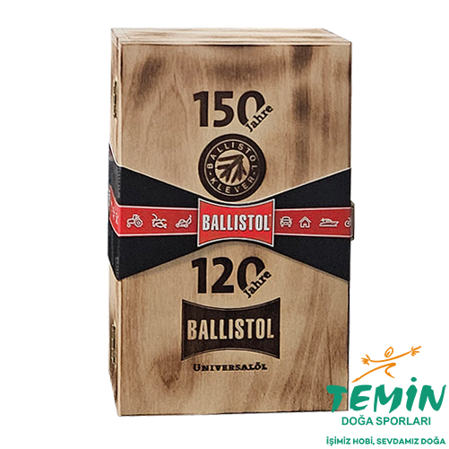 Ahşap kutu içerisinde ; nostaljik görünümlü 150 ml' lik Ballistol çok amaçlı sıvı yağ şişesi ve yıldönümüne özel 120 ml' lik Ballistol çok amaçlı yağ spreyi bulunmaktadır.