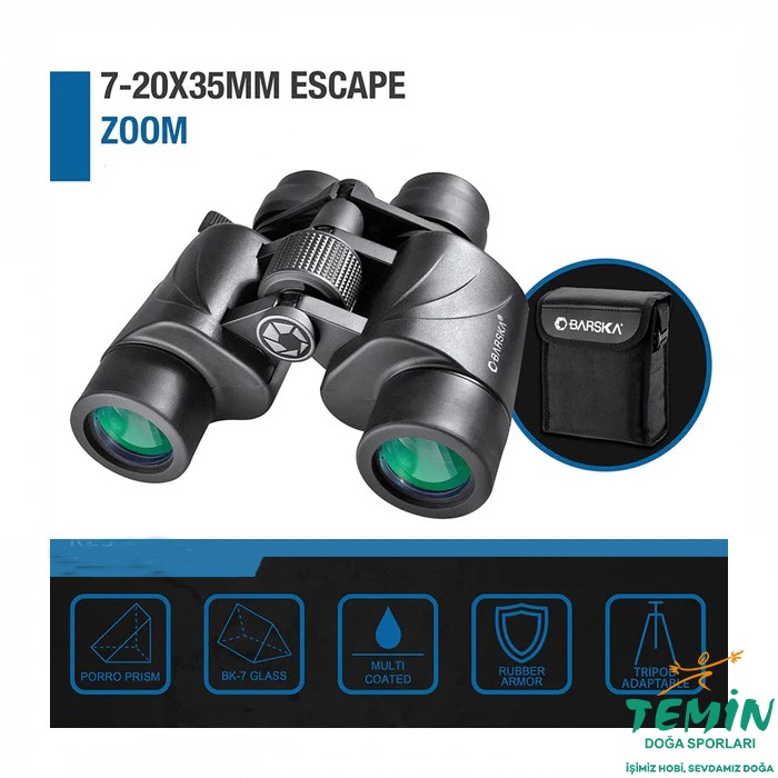 Barska’nın 7-20×35 Escape Zoom Dürbünü, çok katmanlı kaplamalı BK-7 optikleri ve klasik Porro prizma tasarımına sahiptir. 35 mm’lik objektif çapı, dürbünün el ile sabit tutulmasını kolaylaştıracak şekilde dengelenmiş: sallantıyı azaltır ve tripod kullanımını gereksiz kılar. Böylece, beklenmedik manzaralar karşısında dürbünü hızla kullanılabilir.