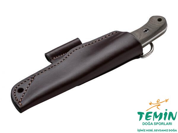 Arbolito Bushcraft Micarta, üzerinde kordon deliği ve 8 mm'lik ateş başlatıcı yuvası bulunan deri kılıfı ile sunuluyor.