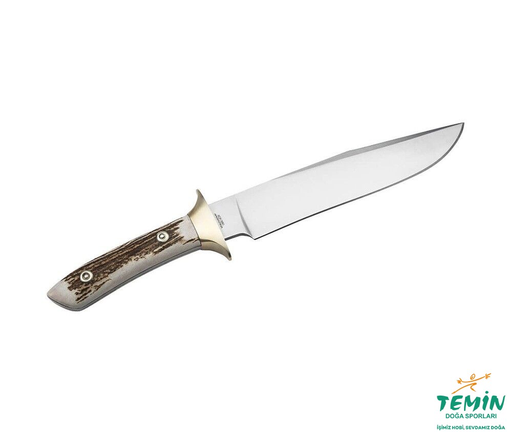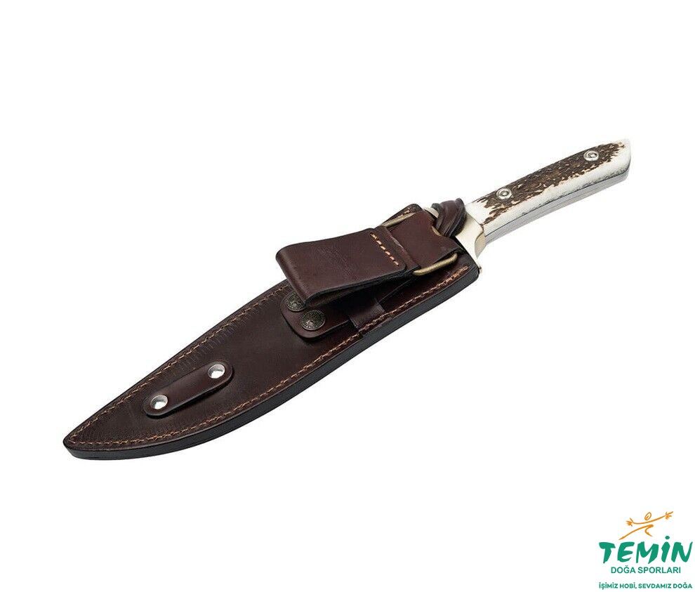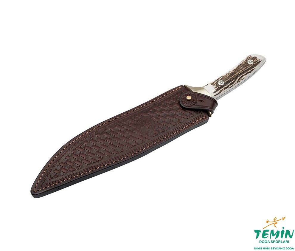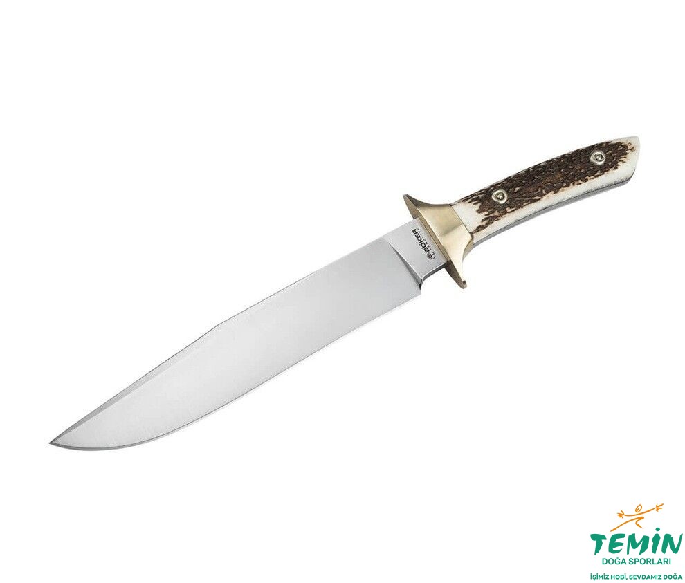 Geyik boynuzu kabzalı El Gigante ile ürün yelpazemizdeki bir açığı kapatıyoruz. Full tang yapıdaki bu son derece sağlam bowie bıçağı şimdiden birçok açık hava meraklısına ve avcıya ilham verdi. Seçkin geyik boynuzundan yapılmış kabzasıyla artık avcılık için mükemmel bir donanıma sahiptir ve bir sabit avcı bıçağının yanı sıra yaban domuzu veya daha güçlü geyik için etkili bir kesici bıçak olarak ikna edicidir. Bıçak ACX390 çelikten yapılmıştır Yüksek kaliteli deri kılıf ile birlikte verilir.