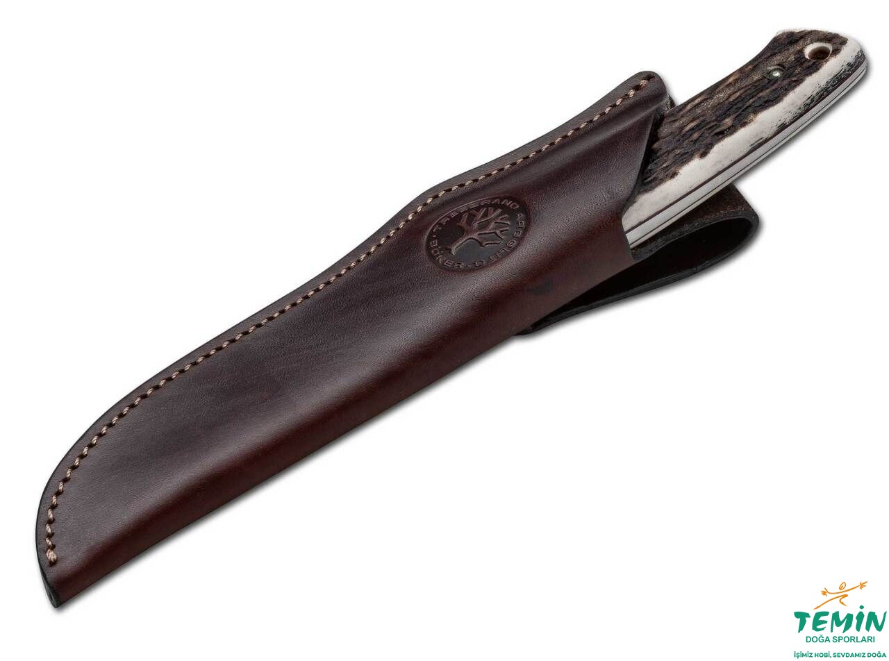 Kırmızı fiber katmanlar (kırmızı fiber liner) üzerine monte edilen geyik boynuzu sap, kavramayı güçlendiren bir ergonomi taşımaktadır. Sapta kordon deliği (lanyard hole) de bulunmaktadır.
