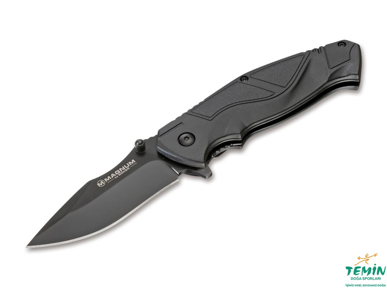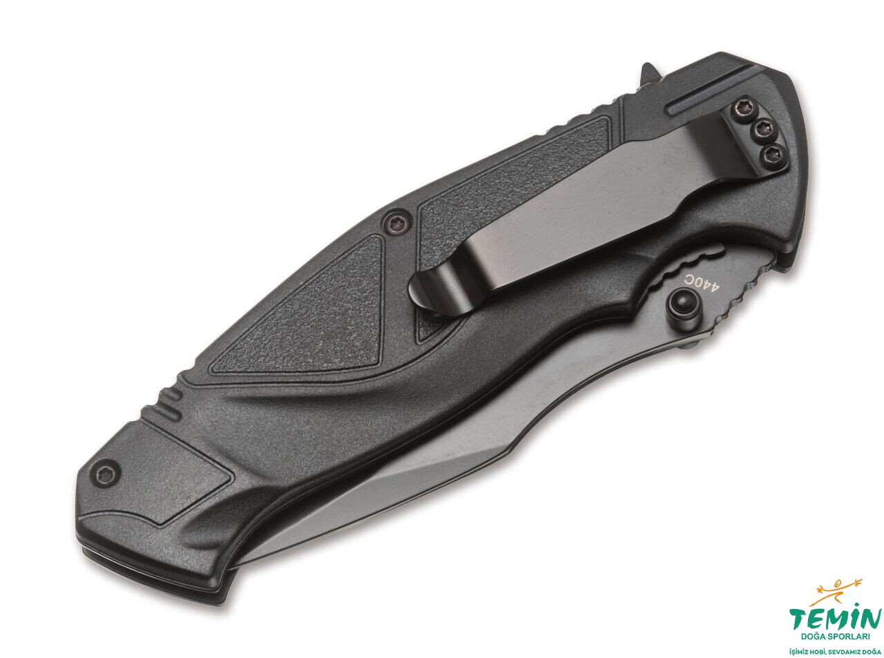 Üç vida ile sabitlenen geniş taşıma klipsi de siyah renkte kaplanmış olan çakı, naylon kılıfı ile sunulmaktadır.