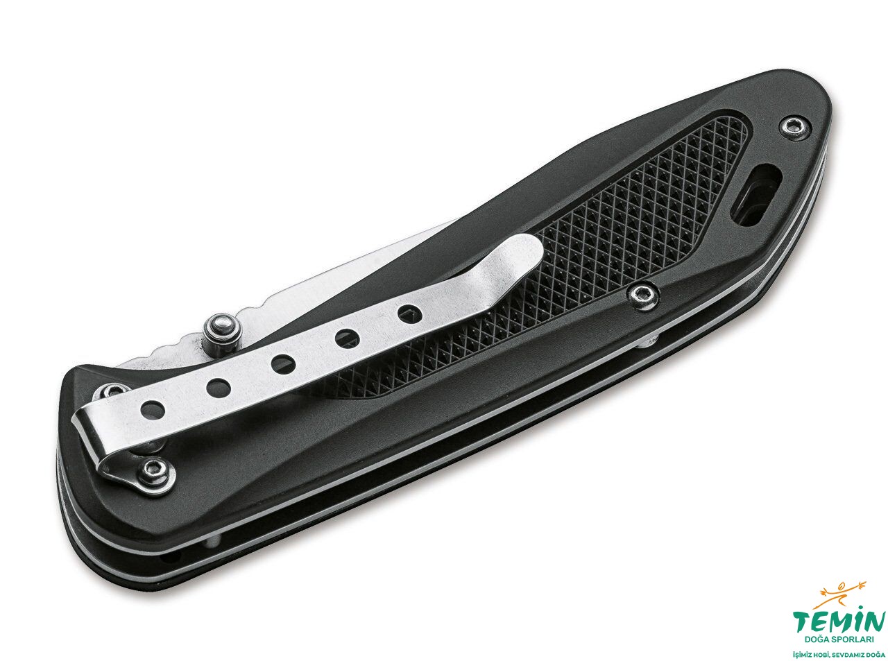 Derin taşıma klipsiyle cepte daha gizli durur, damalı alüminyum sapla daha sağlam tutuş verir. 440C 90 mm namlu, thumb stud + liner lock; 128 g hafif EDC.