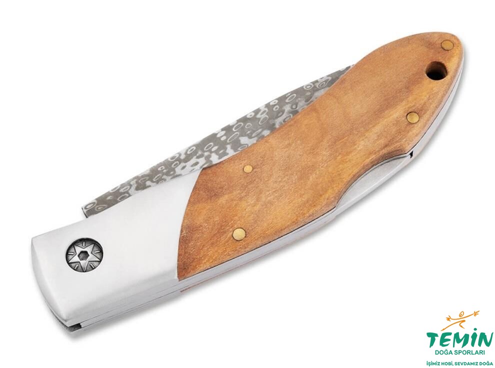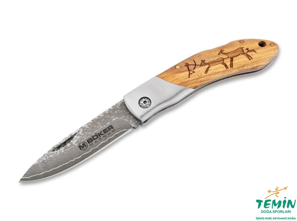 Klasik Magnum Caveman, 37 kat Damascus'tan yapılmış bir ağızla donanmıştır ve tarih öncesi bir görünümle ikna edicidir. Ön ahşap kabza, tarih öncesi mağara sanatını anımsatan ve eski bir av sahnesini tasvir eden bir sanat eseriyle süslenmiştir. Dünya çapında hayranlık uyandıran mağara sanatı, 40.000 yıl kadar önce Taş Devri'nde ortaya çıkmıştır ve o zaman bile insanoğlunun kendini resimlerle ifade etmesi ilkel bir ihtiyaçtı. Tarih öncesi çakının Damascus ağzı tırnak çentiği ile açılır ve sağlam bir backlock kilit ile güvenilir bir şekilde kilitlenir.