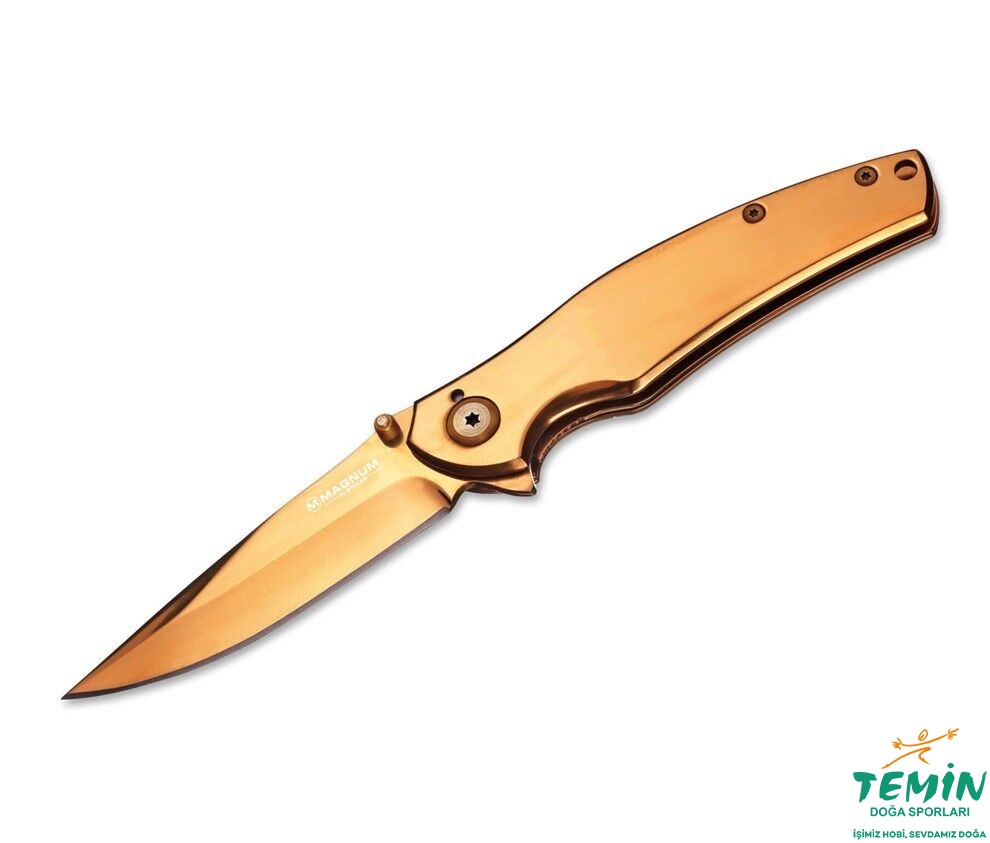 Magnum Gold Finger, değerli metalleri sevenler için mükemmel bir çakıdır. Bıçağın yapısı, 440A paslanmaz namlu, framelock ve paslanmaz çelik sap yüzeyi tamamen altın renginde anodize edilmiştir. Pratik klipsi bile bu asil renkle parıldar. Kordon deliği kullanımı ile birlikte hizmetinize hazırdır.