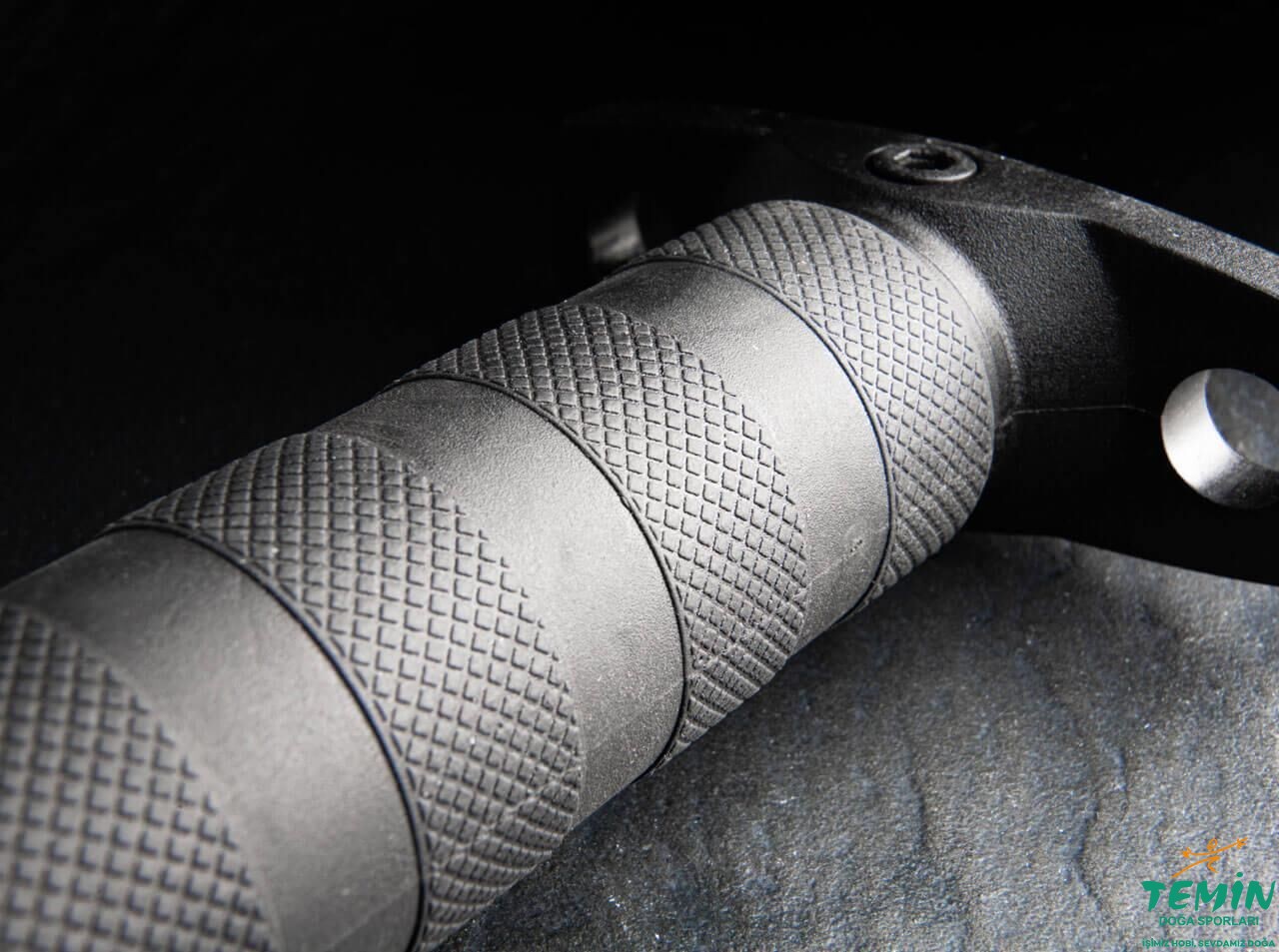 Fakat sağlamlık açısından tartışmalı ve içi malzeme koyulabilecek biçimde boş olan sap yerine, tahrip edilemez FRN'den yapılmış sağlam bir kabza kullanılmıştır. Silindir şeklindeki bu yapının üzerinde üç boyutlu çalışılarak girintili-çıkıntılı yuvarlakların birbirini izlediği ve çıkıntılı kısımların yüzeyinin çapraz desenle pürüzlü hâle getirildiği bir yapı oluşturulmuştur. Bununla yetinilmemiş ve ek kauçuk kaplama kullanılmıştır. Böylelikle, ıslak koşullarda bile daima güvenli bir şekilde kavranabilen ve hem hafif hem de sağlam bir yapı ortaya koyulmuştur.