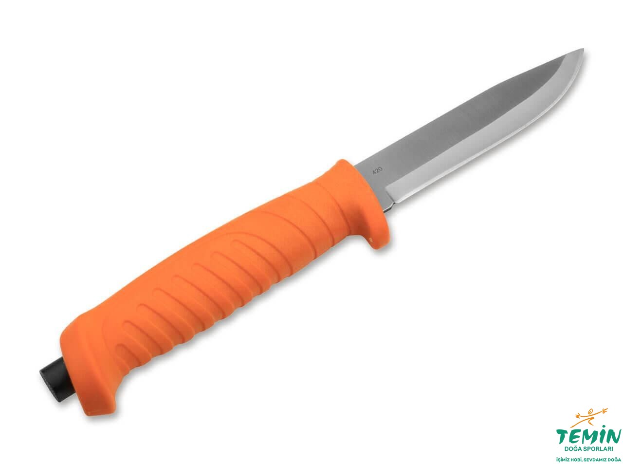 Paslanmaz çelikten (420A) imal edilen bıçak, neredeyse, kırılmazdır ve basit yöntemlerle saha koşullarında bile kolayca keskinleştirilebilir. Sap dibinden dışarı taşan silindirik dip topuzunu (pommel) bir çekiç gibi kullanmanız mümkündür. Söz konusu kısmın yüzeyi; baş aşağı tutuşlarda başparmak tutunmasına yardımcı olma ve ezilecek cisimleri kavrama gibi amaçlara yönelik yontulu-girintili bir yapıdadır. Tahrip edilemez plastik sap; doğada kolay görünen turuncu renktedir, enjeksiyonla kalıplanmıştır ve hem namluyu hem de dip topuzunu bir arada tutmaktadır. Sapın bütünleşik koruyucu tırnakları ve kavramaya uygun yapılandırılan yüzeyi, güvenli ve kontrollü bir kullanıma hizmet etmektedir. Tüm bunlar, bıçağın kullanım alanını genişleten pratik çözümlerdir.