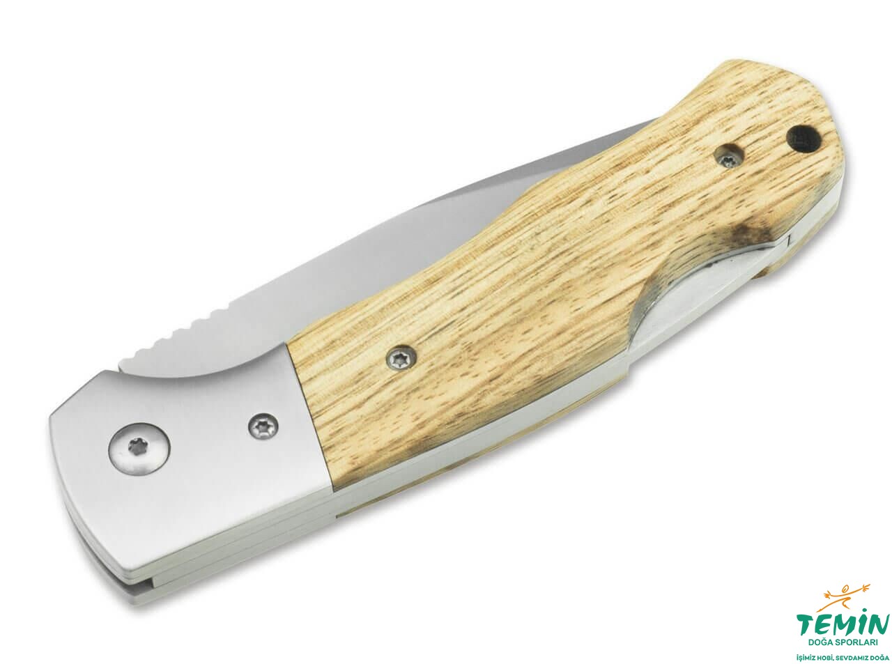Uç kısmının arkası inceltilerek saplanma yetisi artırılan sivri uç (clip point) yapısındaki namlusu, 440 çelikten imal edilmiştir. İçbükey ağız açımı (hollow grind) yapılan keskin namlu, tırnak çentiği yardımıyla kolay açılabilmekte ve güvenilir arkadan kilit (lockback) mekanizmasıyla sabitlenmektedir. Keskin kenarın altındaki minik çentik, kesmeye saplayarak başlamaya hizmet etmektedir. Kavramaya yardımcı çentikler (jimping) sayesinde kontrolü kolaylaşan çakının sap malzemesi ise zebra ağacıdır. Boylu boyunca uzanan net çizgilere sahip bu açık renk ahşap, paslanmaz çelik astarlar üzerine takılmıştır. Sap dibine yakın konumda bir kordon deliği (lanyard hole) de bulunan büyükçe çakı, yine paslanmaz çelik balçaklarla desteklenmiştir.