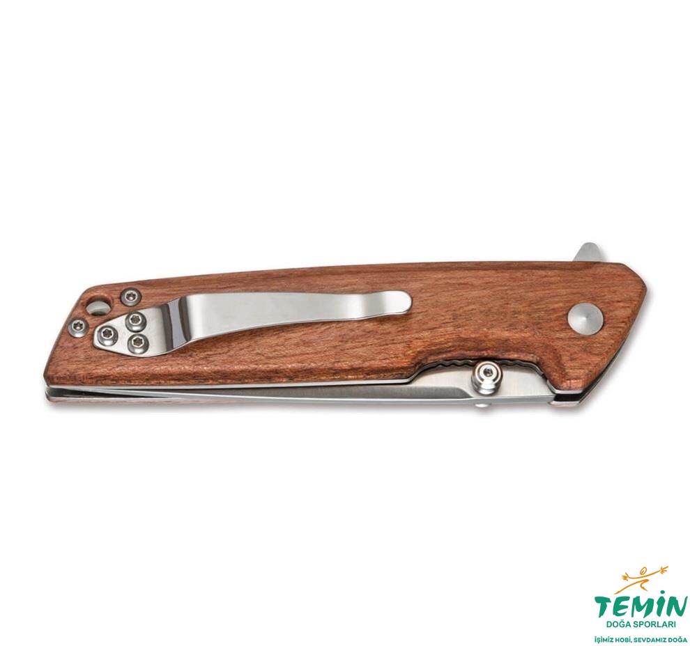 Magnum Slim Brother yalın, sağlam bir tasarım, mükemmel detaylandırma ve özgün özelliklerinin klasik bir bileşimini sunar. Paslanmaz 440A'nın arkaya yakın sivri uçlu ağzı bir ricasso'ya sahiptir ve güvenilir bir linerlock ile sabitlenmiştir. Bir flipper ile ya da dikkatlice döndürülmüş bir sıkıştırılmış thumbstud ile açılabilir. Sap kabzası, zengin bir renge sahip olan ve dokunulduğunda sıcak bir his veren Bubinga ağacından yapılmıştır. Sıkıca monte edilmiş klips (uç yukarı).