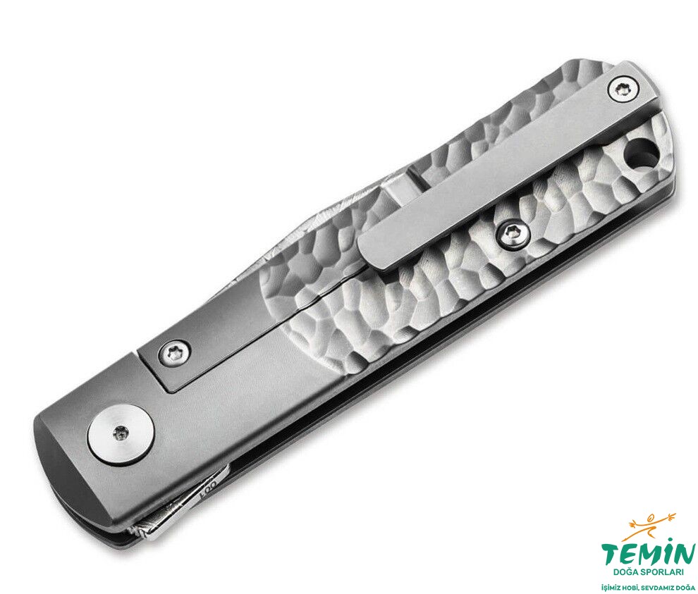Bıçak açıldığında göze çarpmayan açma tırnağı tamamen ortadan kaybolurken, titanyum cep klipsi (uç yukarı, sağ el kullanımına uygun) güvenli ve şık bir taşıma imkanı sunar. İp deliği ek taşıma seçenekleri sunarken, pivot vidası üzerindeki Böker ağaç amblemi zarif bir son dokunuş katar.