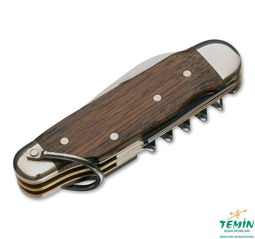 Altı parçalı Böker Kamp Çakısı 1869 yılından beri Solingen'deki fabrikamızda elle üretilmektedir. Tarih boyunca birçok kez kopyalanan konsept, çok sayıda kullanışlı araçları yüksek kaliteli bir çakıda birleştirir. Diğer tüm çok işlevli çakılardan daha uzun süredir üretimdedir. İki ağız, bir konserve açacağı, bir şişe açacağı, bir deri zımba ve oyucu, bir mantar tornavidası ve bir düz tornavida sunar. Her iki ağız da Solingen'in klasik bıçak çeliği olan, korozyon direncini kenar tutma özelliğiyle birleştiren ve kolay bilenen 4034 çeliğinden yapılmıştır. Model yelpazemizin emektarı, cilalı nikel gümüş desteklere ve koyu füme yerel meşe sap kabzalarına sahiptir. Pratik kordon kayışı sayesinde çakı çantalara veya diğer nesnelere kolayca takılabilir. Yüksek kaliteli keçe kılıfı dahildir.