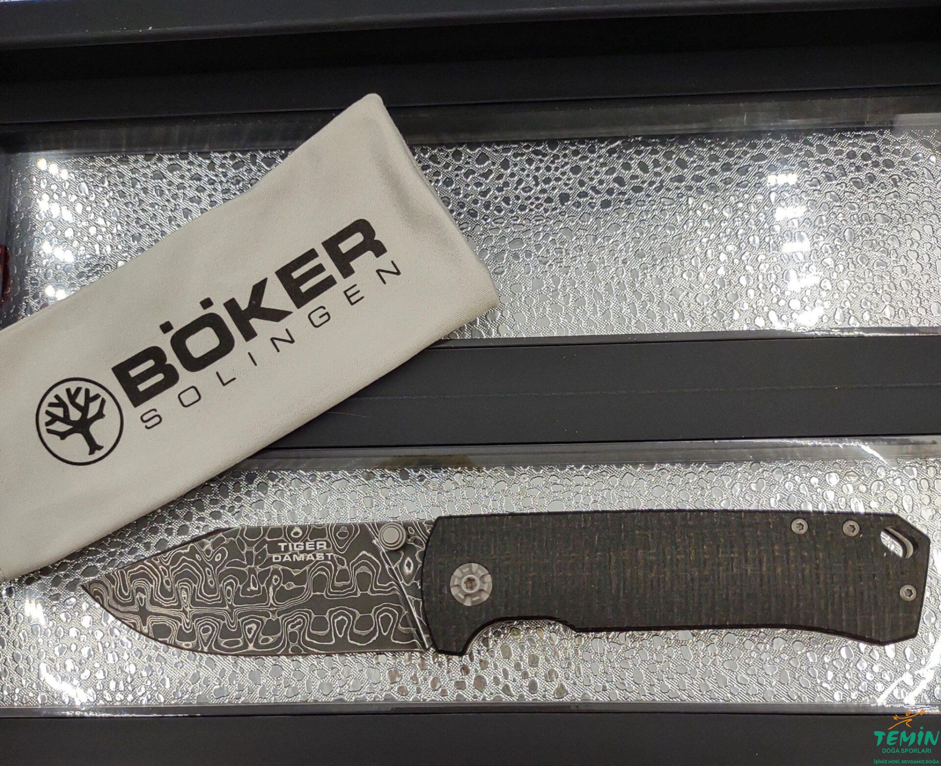 Böker’in Solingen’deki fabrikasında, el işçiliğiyle üretilen ve seri numarası taşıyan Böker Tiger-Damascus; orijinallik sertifikası ve şeffaf sergi kutusu ile sunuluyor.