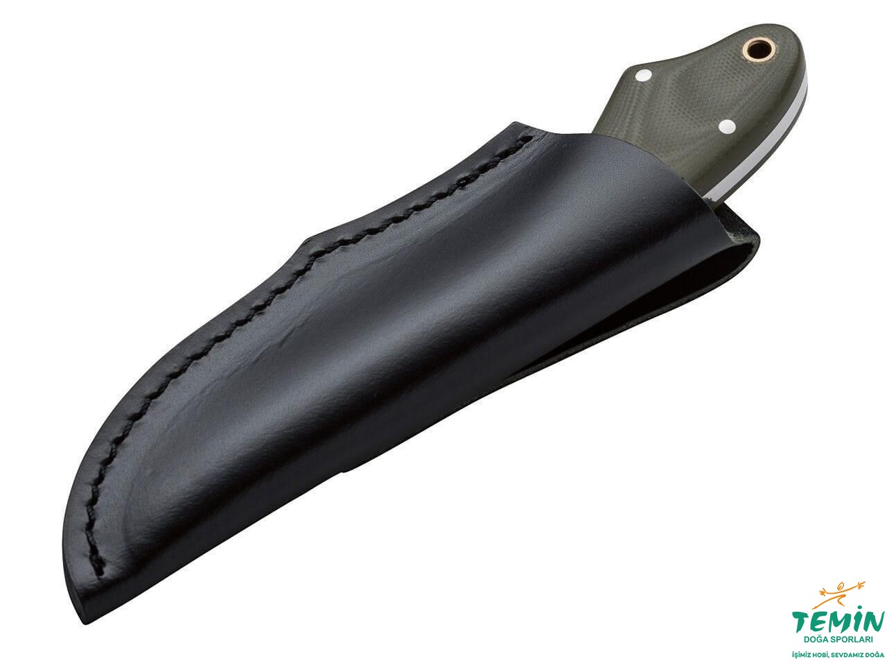 Kordon deliğine sahip bıçak, siyah renkli deri kılıfı ile sunuluyor.
