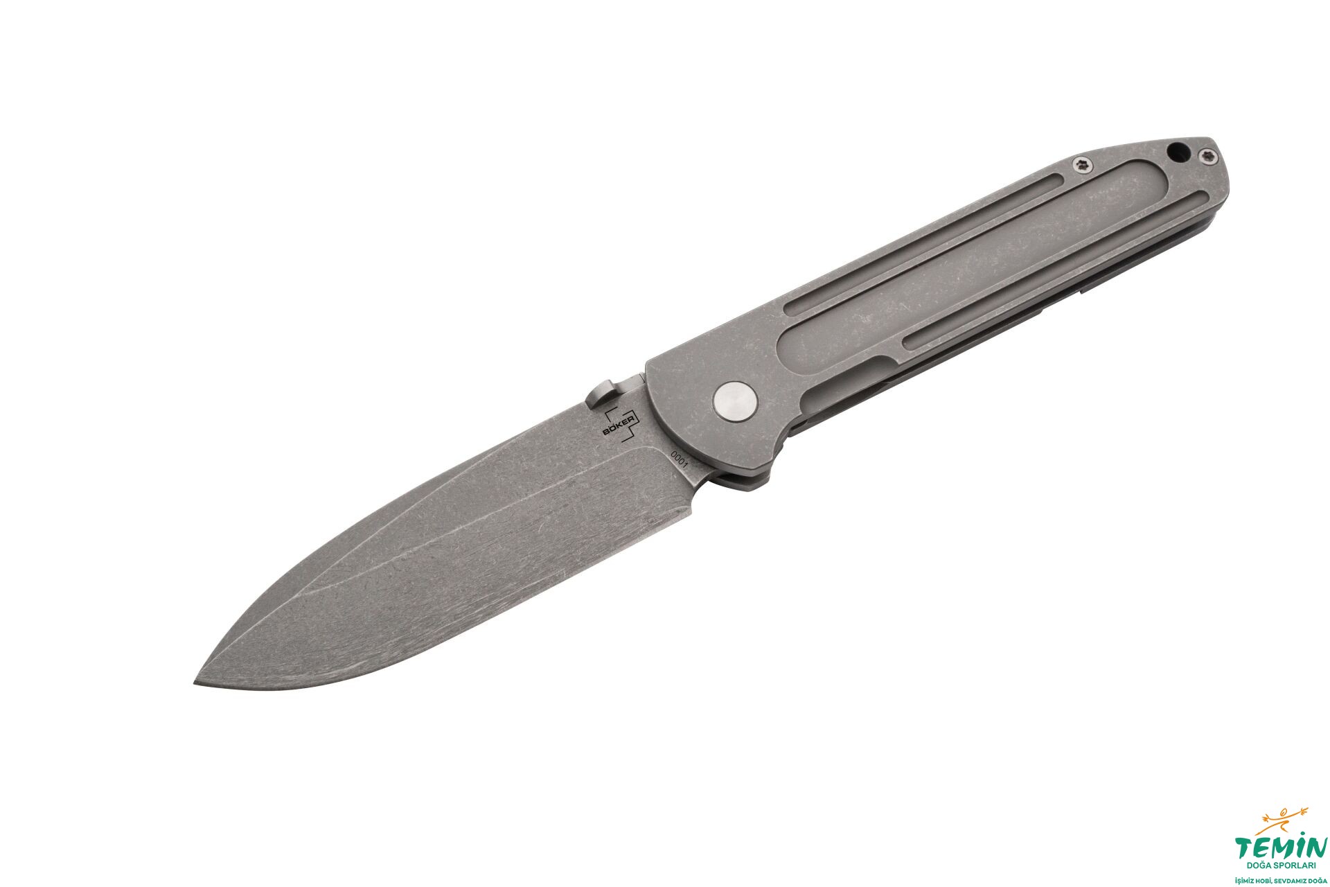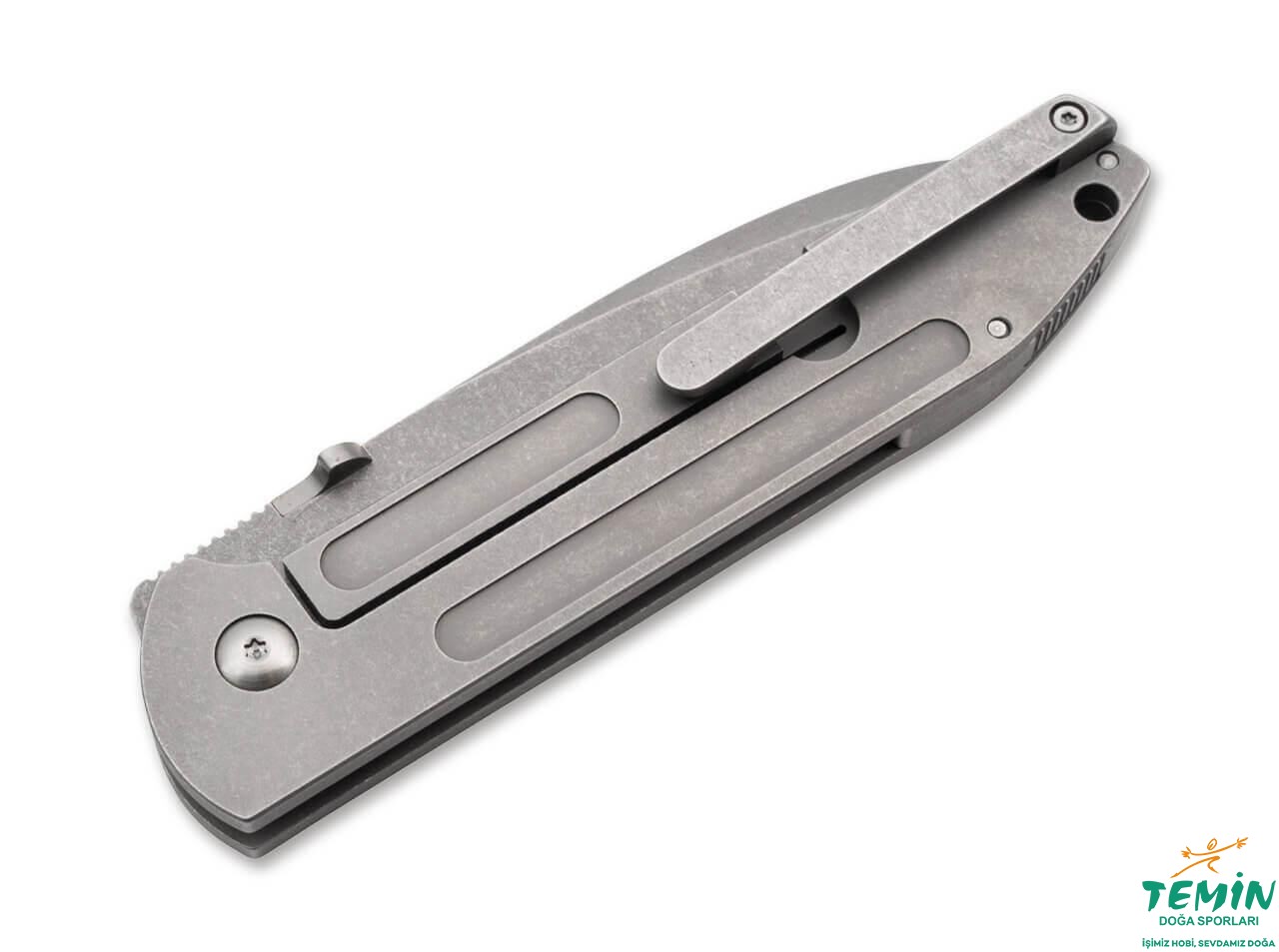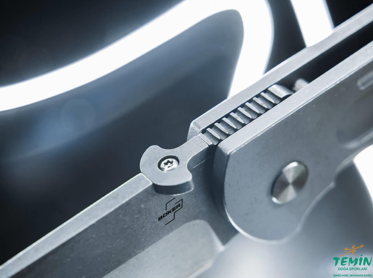 Sap kısmının dip arka kısmına doğru kordon deliğine (lanyard hole) de yer verilen Böker Plus Evade (01BO384); namlu, sap ve ara parça gibi, taşlanan (stonewash) ve gri renk kazandırılan paslanmaz çelik cep klipsi (çıkarılabilir) sayesinde kolaylıkla taşınabilmektedir.