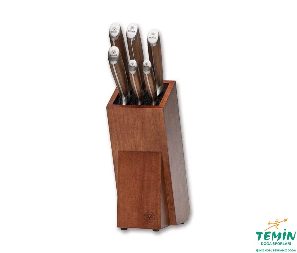 Boker Forge Wood serisinden altı bıçakla donatılmış Boker Bıçak Bloğu Gusto Wood: Ofis Bıçağı, Çok Amaçlı Bıçak, Oyma Bıçağı, Santoku Bıçağı, Şef Bıçağı, Ekmek Bıçağı.