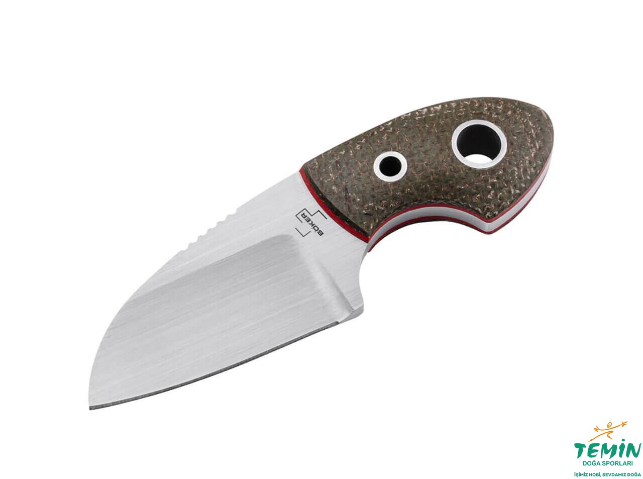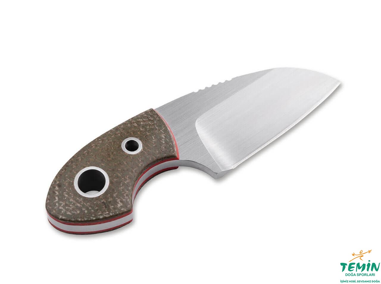 Kullanışlı bir yol arkadaşı olan Böker Plus Gnome Micarta D2 (02BO324), kydex kılıfıyla sunulmaktadır. Birlikte verilen top zincir, Gnome’un boyun bıçağı olarak kullanılma iddiasını vurgulamaktadır.