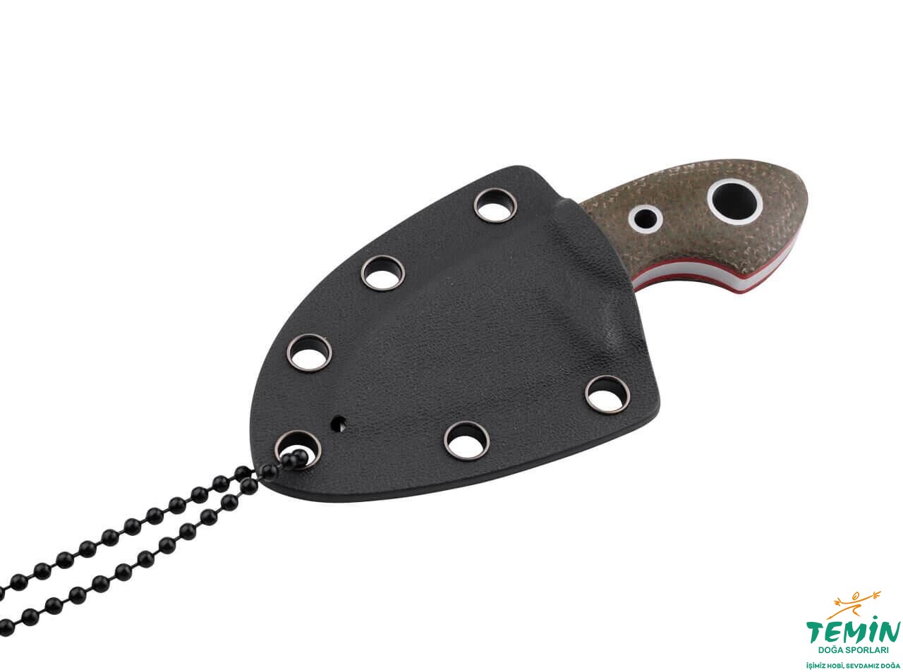Boyunda taşımaya uygun mini “yük atı”: 47 g, micarta sapla sıkı tutuş. D2 56 mm namlu; Kydex kılıf ve top zincirle sahaya hazır.