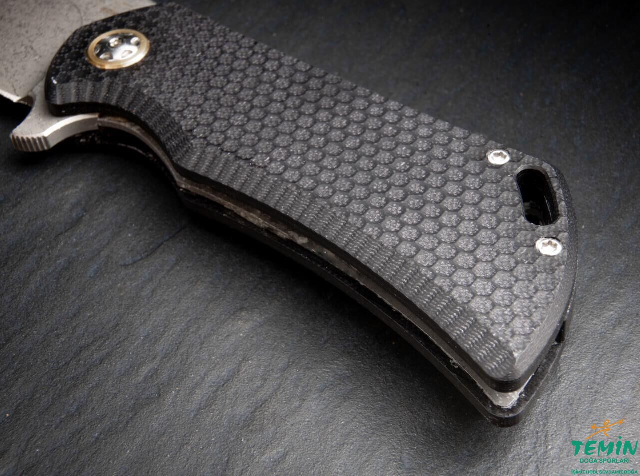 Sap, kilit görevindeki çelik astar dışında -ki onun da üzerinde ağırlık azaltıcı oyuklar mevcuttur- siyah G10’dan imal edilmiştir. Diğer deyişle, her iki kanat ve ara parça G10’dur. Zaten kaydırmaz nitelikteki G10’un yüzeyine, CNC ile, petek dokusu oluşturacak biçimde pürüzlü bir yapı kazandırılmış ve iyi kavramaya olumlu katkıda bulunulmuştur. Çakı parçalarının bir araya getirilmesinde cıvatalardan faydalanılmıştır. Pivot bağlantı elemanının bakır pulu, çakıya renk katan bir vurgudur.