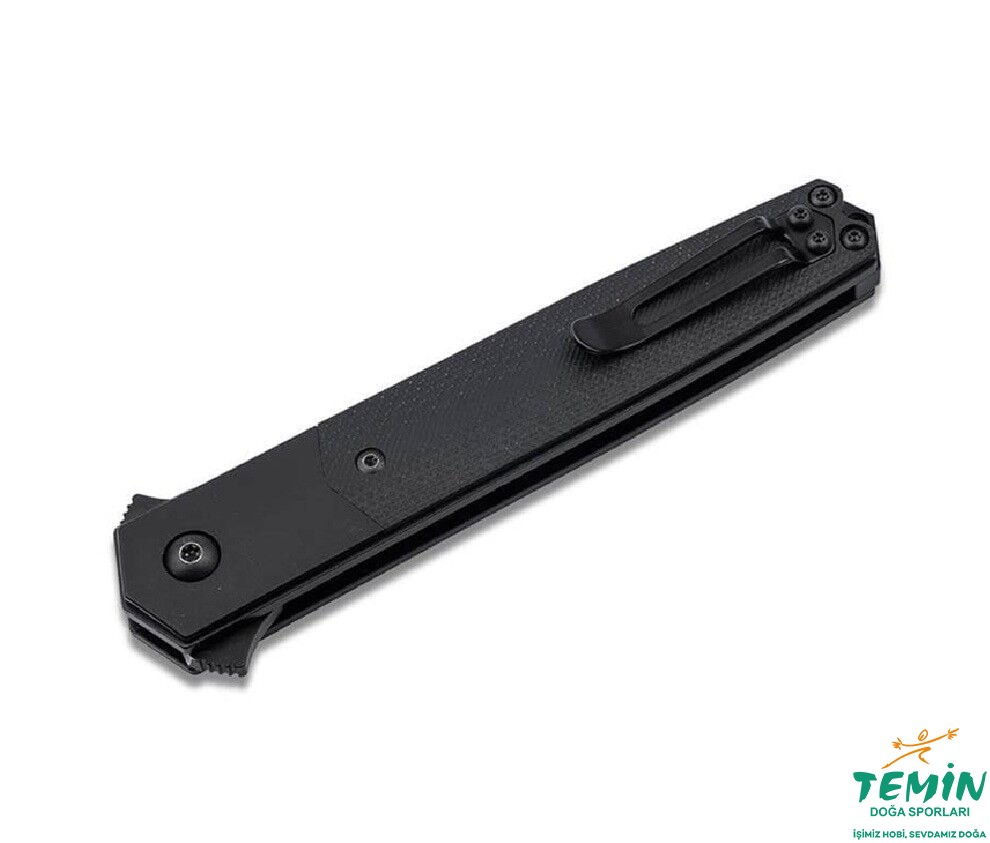 Bu çakının benzersizliği, asil titanyum desteklere ve G10'dan yapılmış sap kaplamalarına sahip sapı ile vurgulanıyor; bu özellikler, tamamen siyah bıçağa uyumlu bir şekilde çok özel bir görünüm kazandırıyor. İnce tasarımı ve özel malzemesi, Kwaiken'i bir beyefendi katlama bıçağı ile taktik bıçağı arasında asil bir geçiş modeli haline getiriyor. Saklama için yüksek kaliteli bir naylon kılıf ile birlikte sunulur. Çıkarılabilir klipsli (tip-up/r).