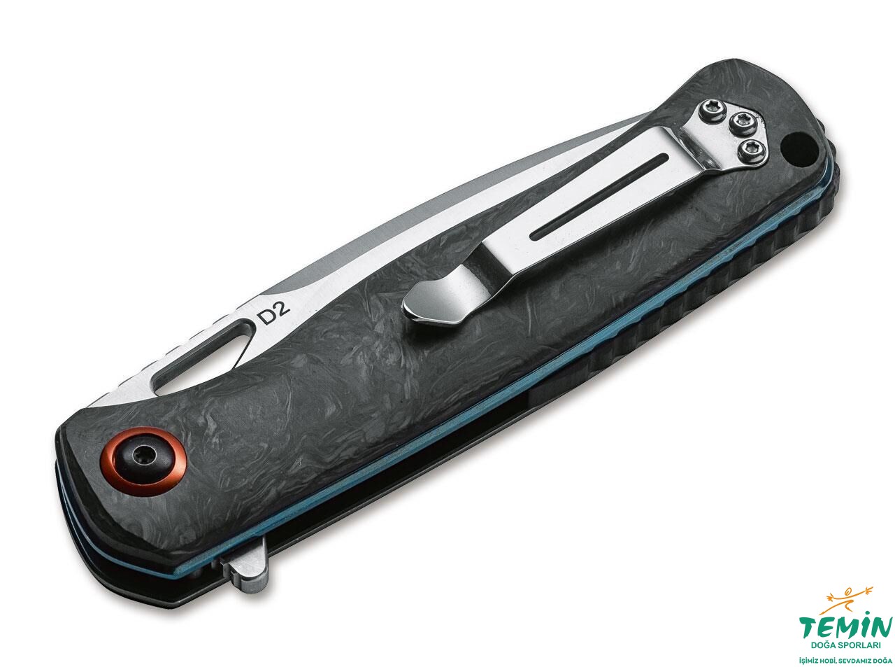 Sap biçimi olarak kano biçimindeki çakılardan (canoe knives) esinlenildiği izlenmektedir. Bu ergonomik yapı, daha vurgusuz betimlenerek ve fakat derin bir işaret parmağı yuvası açılarak başarılı şekilde değiştirilmiştir. Yandan kilitli (linerlock) çakının sapı, mavi renkte anodize edilen paslanmaz çelik astarlar üzerine takılan vahşi desendeki karbon fiberden oluşturulmuştur. Sap malzemesinin yerine takılmasında kullanılan cıvataların diğer malzemeleri gölgelememesine ve onlarla uyumlu olmasına dikkat edilmiştir. Alttaki cıvata, astarlar gibi mavi renktedir. Pivot pim ise karbon fiber ile uyumlu biçimde siyahtır. Burada kullanılan ve çakıyı ismine layık hâle getiren turuncu renkteki pul, detaylara verilen önemi göstermekte ve özellikle sap malzemesinin ihtişamını öne çıkaran bir kontrast oluşturmaktadır. Ara parça olarak kullanılan siyah renkte G10 üzerinde kavramaya yardımcı çentiklere yer verilmesi de kaliteyi gösteren detaylardan biridir.