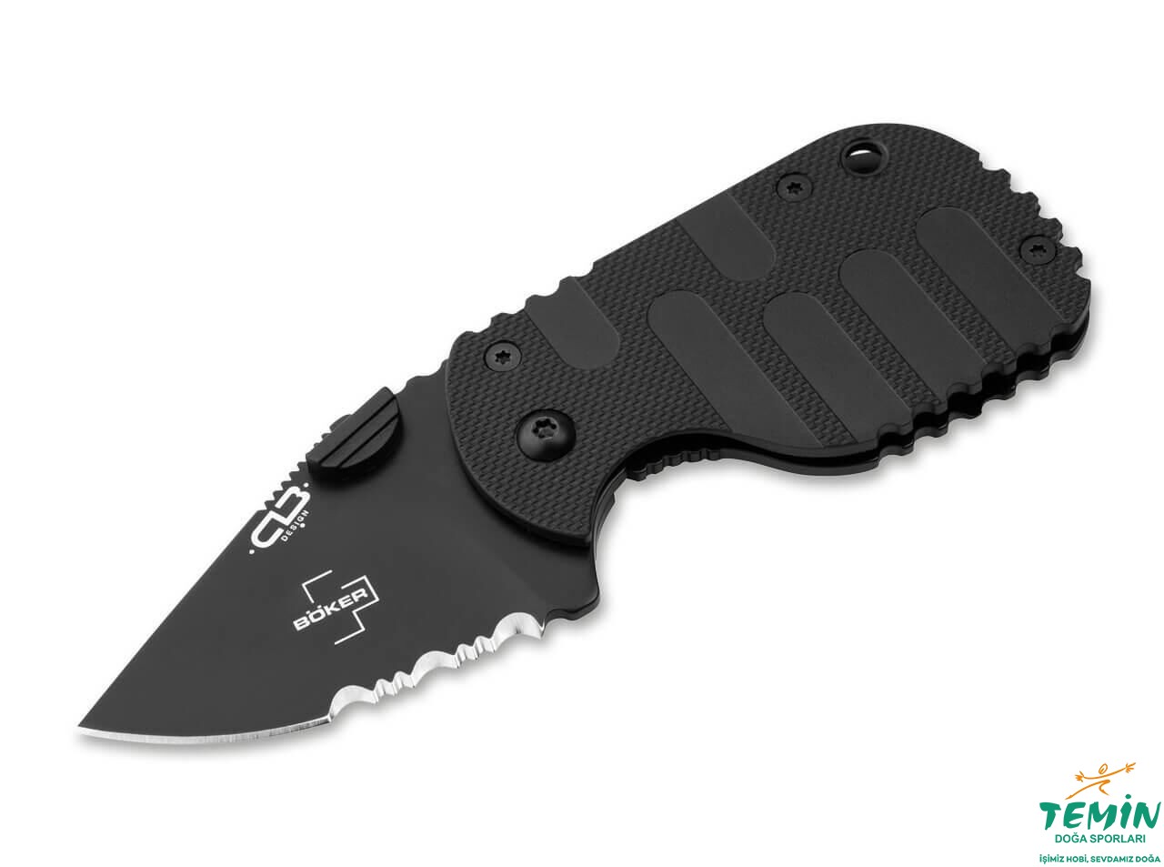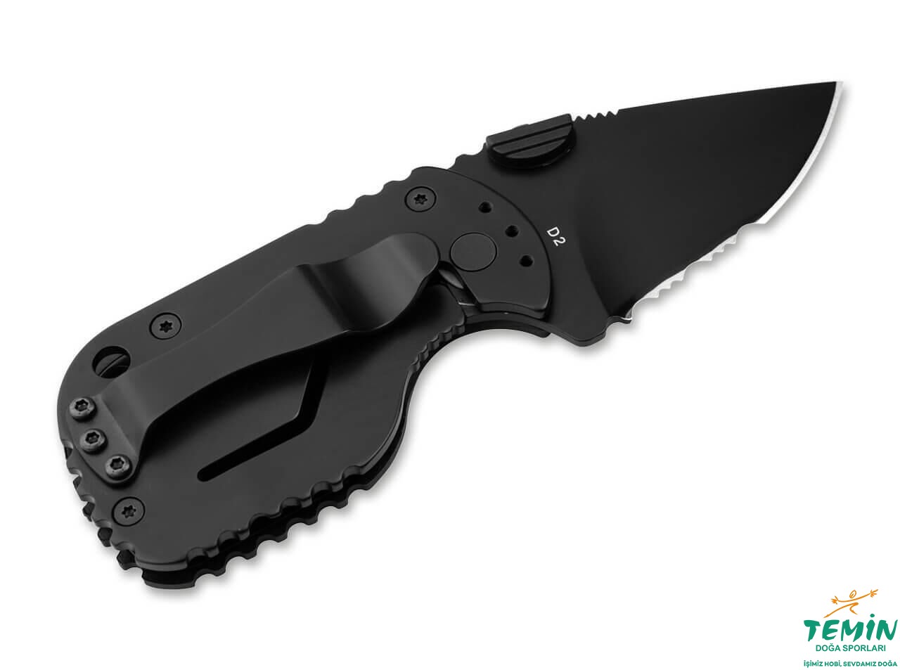 Cepte yok gibi: 69 g ultra kompakt Subcom 2.0. Çift thumb stud ile hızlı açılır, 2 mm frame lock güven verir. D2 58 mm kısmen tırtıklı namlu, all-black gövde; klips + kordon deliği.