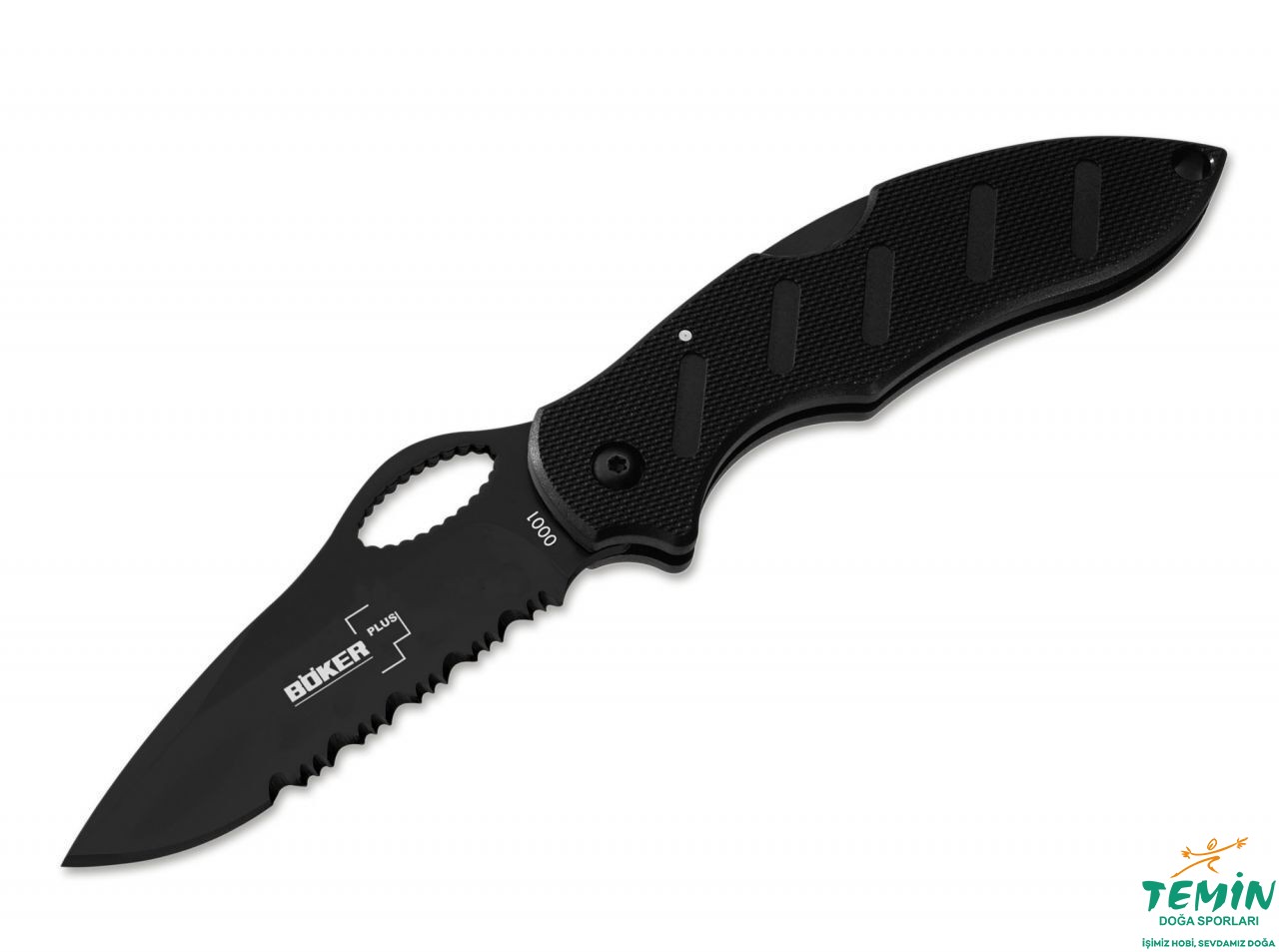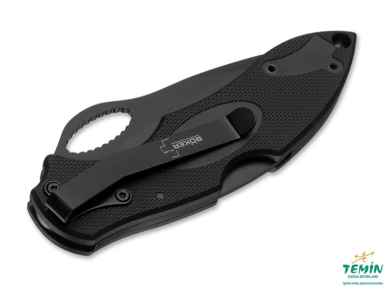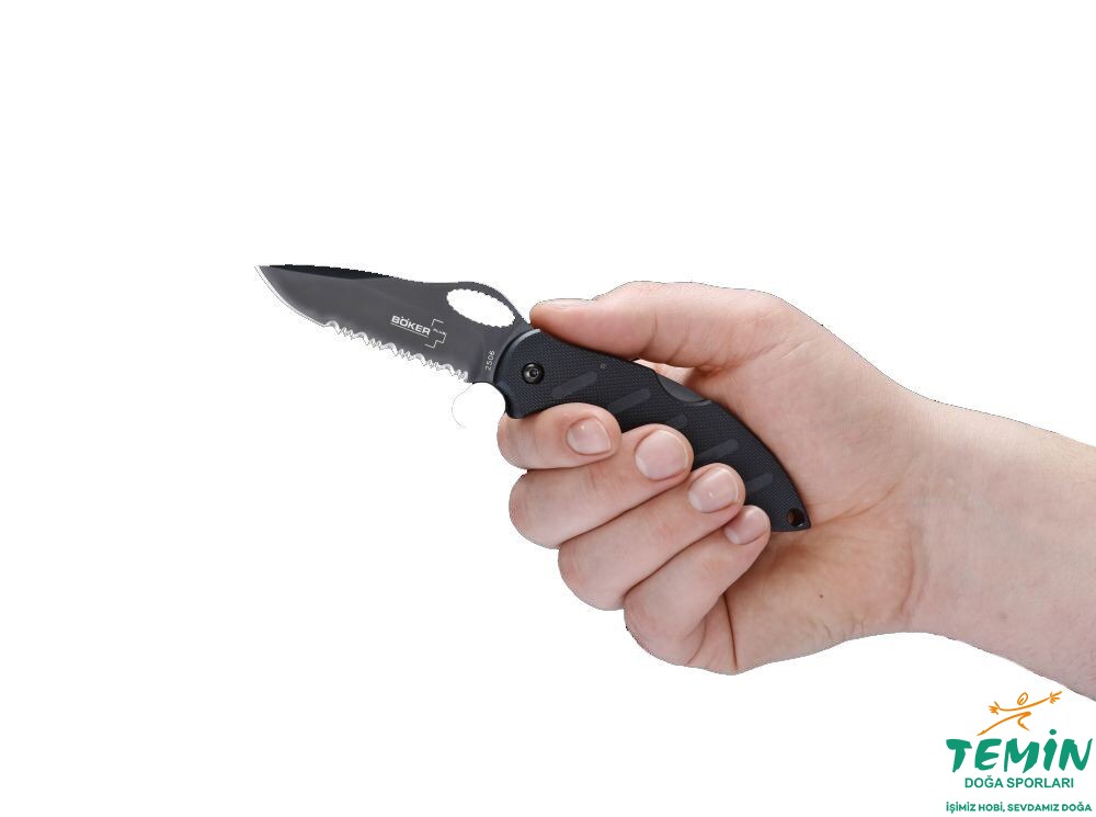BökerPlus'ın taktik kategorisinde yer alan tümüyle siyah çakısı. Kısmi tırtıklı namlu AUS-8 çelik, kabza ise zytel. Lockback (arkadan kilitli) çakı tek elle açılabilmesi için başparmak oyuğuna (thumb hole) sahip. Taşıma klipsinin yönü değiştirilebiliyor.