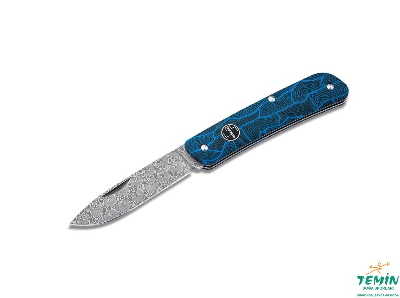 Slipjoint (Slipjoint, kayar eklemli anlamına gelmektedir. Bu çakılarda mekanik bir kilit bulunmaz.) bir çakı olan ve kolay açılması için tırnak çentiğine yer verilen Böker Plus Tech Tool Blue Damast (01BO559DAM), yönü değiştirilebilir cep klipsi sayesinde kolaylıkla taşınabilmektedir.