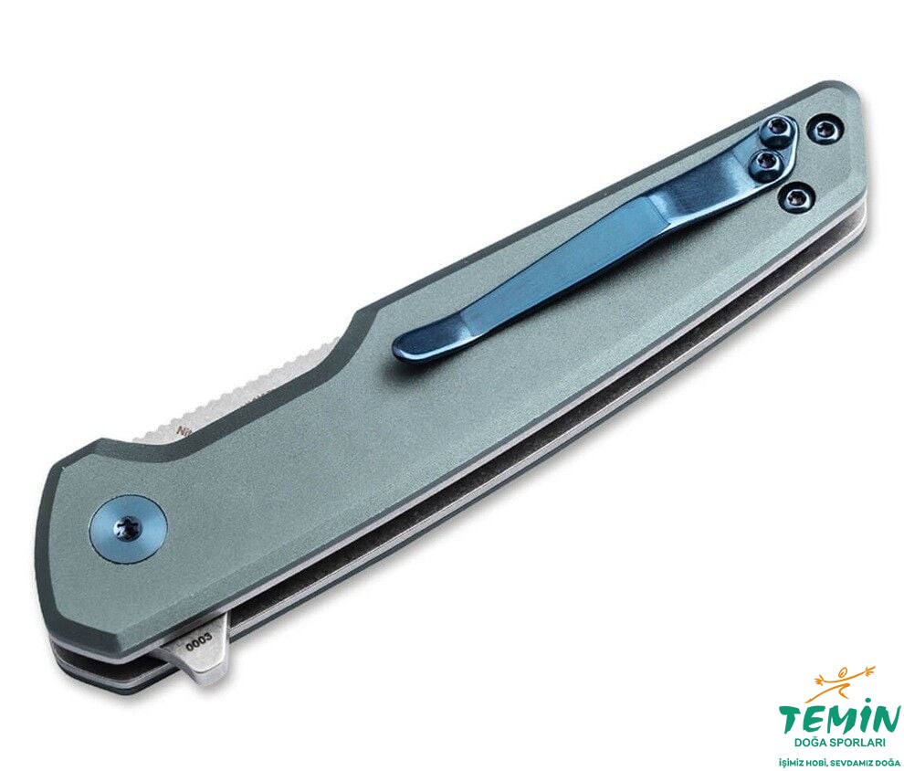 Tip-up klips (r), düz bıçak pivot vidası ve sap vidaları, mavi eloksal elemanlar, cep bıçağına özel bir dokunuş katar. Sert taş yıkama kaplaması ve kaymaz jimpingler ve dekoratif ricasso ile bıçak sırtı, görünümü ve performansı tamamlar.