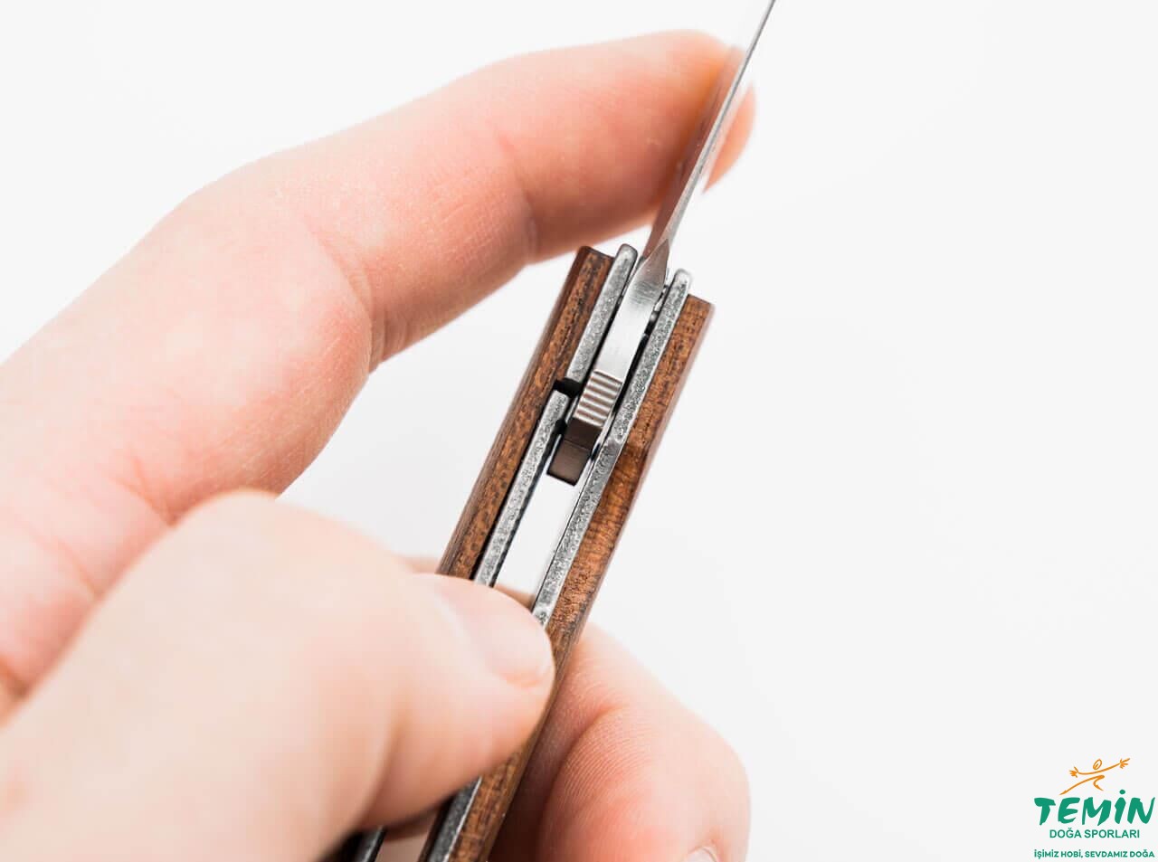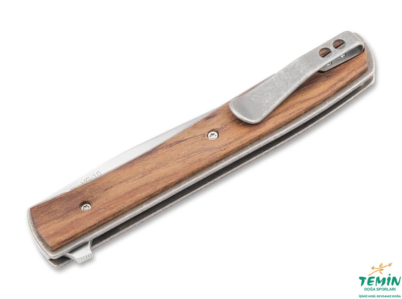 İnce, uzun ve düz yüzeyli bu şık çakı, yine titanyumdan imal edilen cep klipsi (çıkarılabilir) sayesinde kolaylıkla taşınabilmektedir.