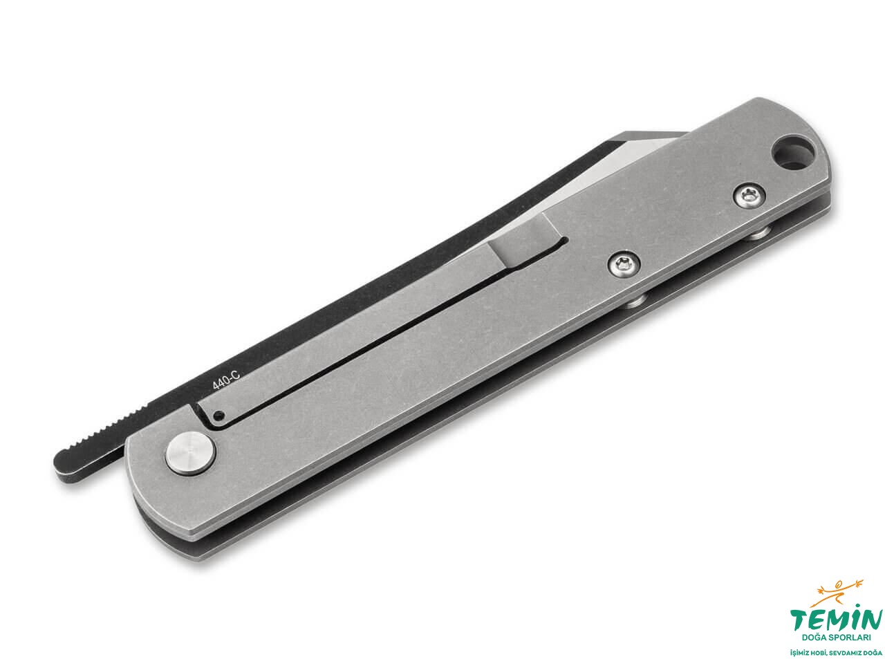 Bıçak çeliğinde kalite standartlarını belirlemiş 440C’den imal edilen ve bir usturayı andıran ters tanto yapıdaki namluya, yüksek düz ağız açımı (high flat grind) uygulanmıştır. Çift tonlu bir görünüm (yanaklar koyu ve ağız saten parlaklığında) alan namlu; kendisinin uzantısı olan bir levye ile (bir ön flipper gibi), istenen elle ve kolaylıkla açılabilmektedir. Söz konusu kısım üzerinde oluşturulan sıralı çentikler (jimping), tutunmayı kolaylaştırarak kontrolü artırmaktadır. Keskin kenarın altındaki minik çentik, kesmeye saplayarak başlamaya hizmet etmektedir.