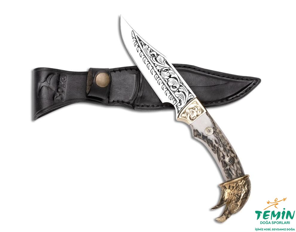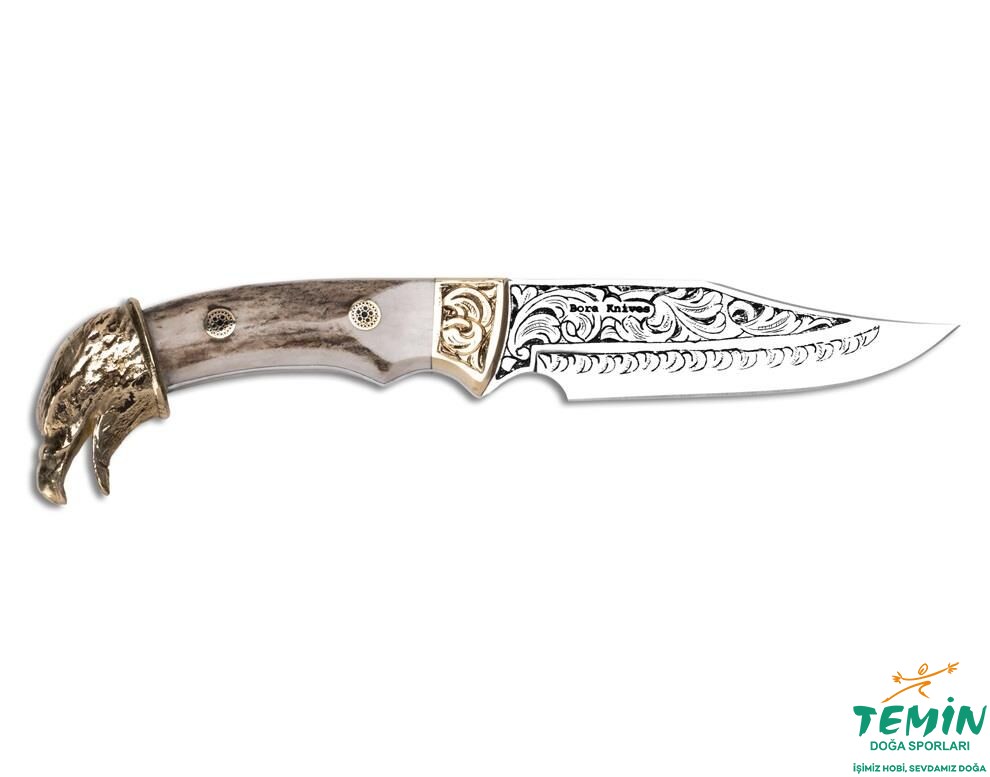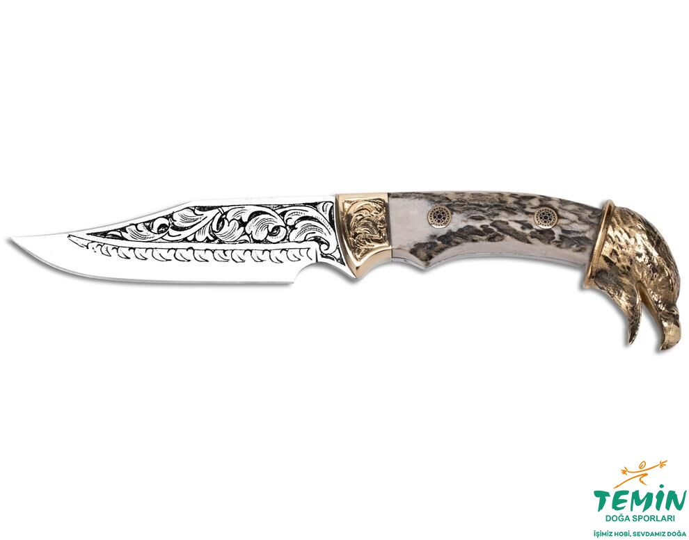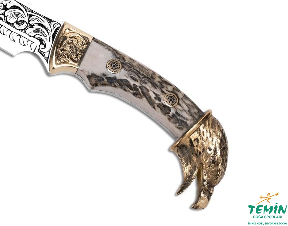 Bıçağın sap malzemesi olarak ''Geyik Boynuzu'' kullanılmıştır. Her sene üreme döneminden sonra geyiklerin boynuzları düşer ve yenisi çıkar. Orman Bakanlığımızdan sınırlı sayıda satın aldığımız geyik boynuzu, güçlü, sert ve dayanıklı yapıdadır. Doğal yapısı gereği her bıçak üzerinde farklı desen ve doku oluşturmaktadır. Bu özelliği ile son derece iyi kavrama imkânı sunan geyik boynuzu, görselliğe önem veren kullanıcılar tarafından da tercih edilmektedir.