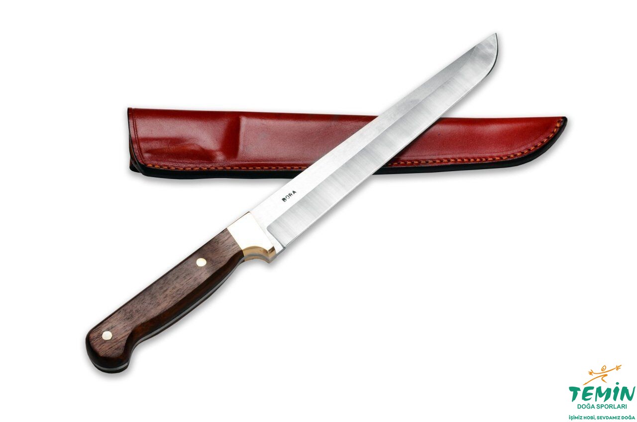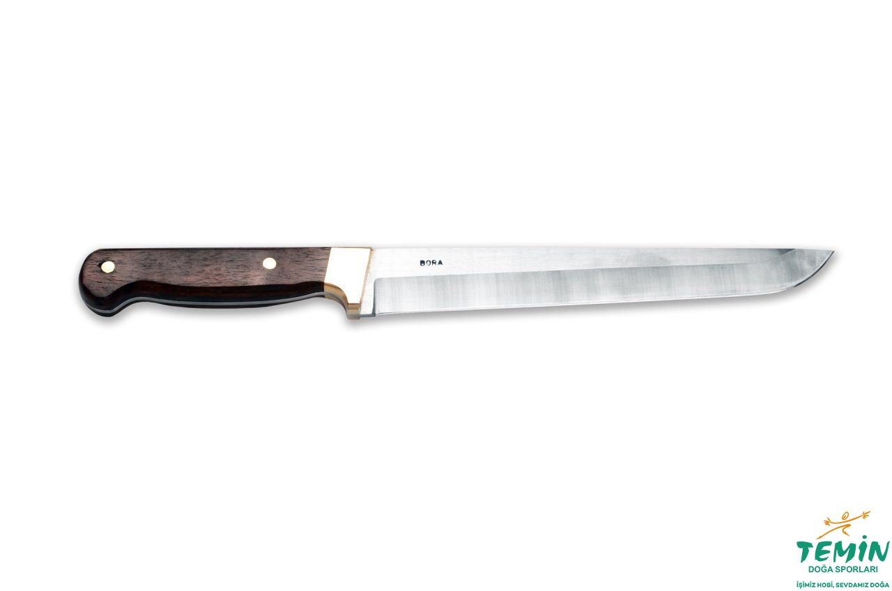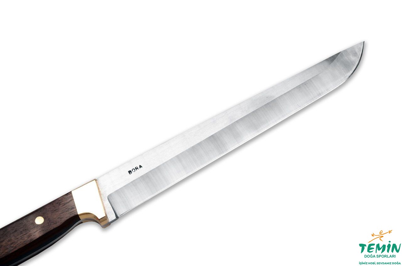 Kurban kesimi için geliştirilmiş el yapımı Bora 702G; Thyssen-Krupp 4116 paslanmaz çelik ve wenge sap kombinasyonuyla güvenli tutuş ve kontrollü kesimde fayda sağlar. 1. sınıf deri kılıfı ile birlikte gelir.