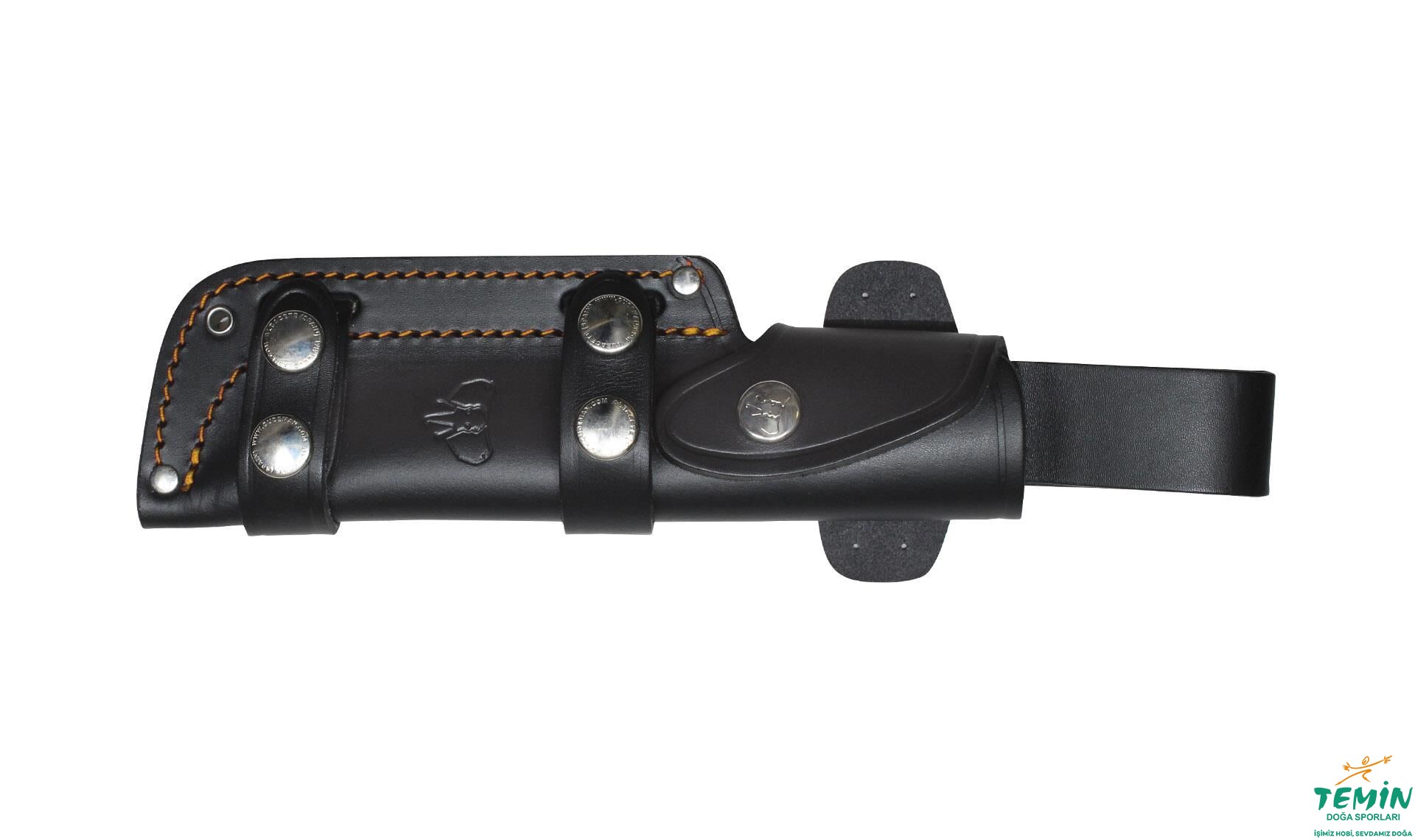 251-J, siyah renkteki deri kılıfıyla sunulmaktadır. Kılıf üzerindeki turuncu dikişler, G10 sapla uyumludur.