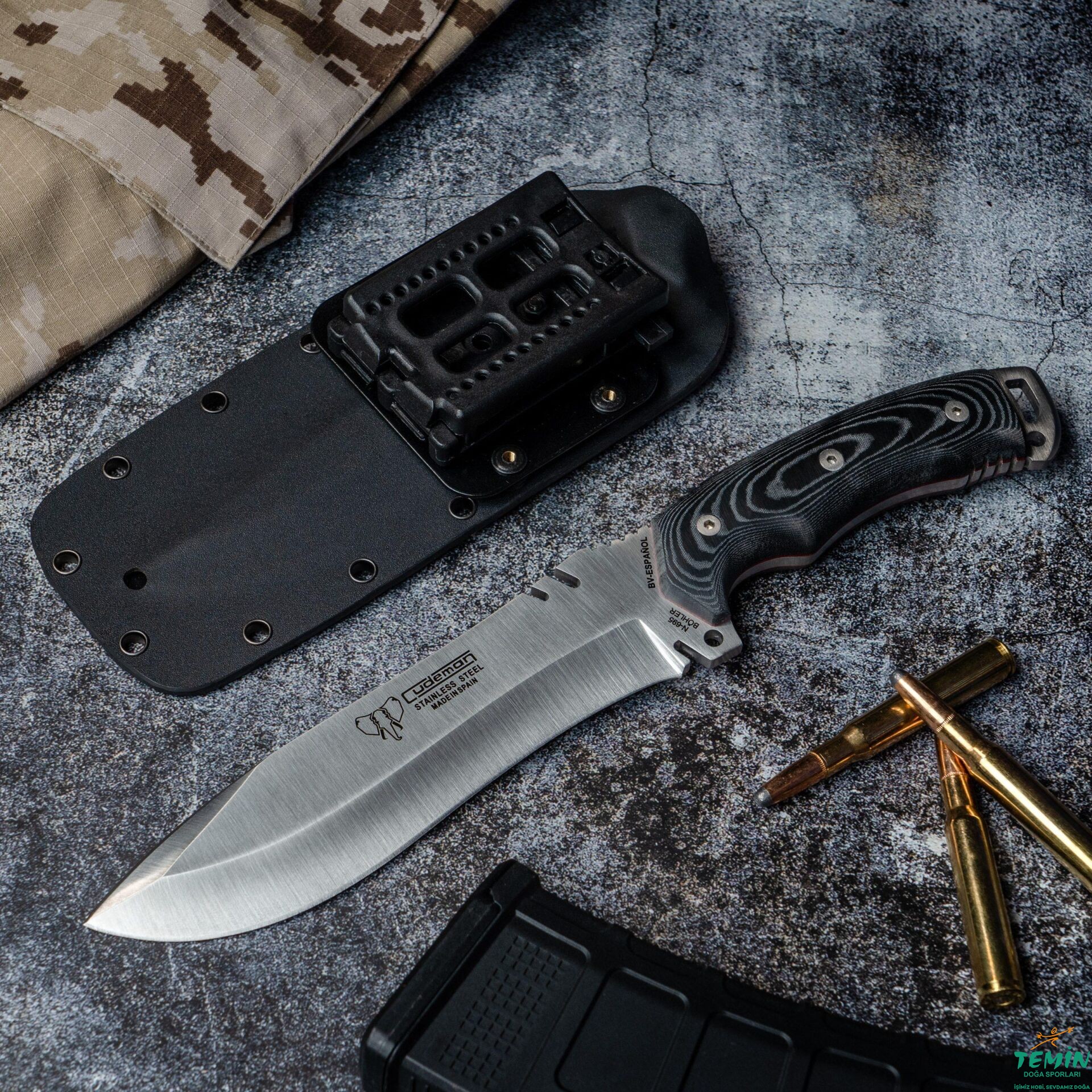 Uzun (toplam 31 cm) ve geniş (4,5 cm) bıçakta, 5 mm et kalınlığındaki, Böhler N695 çelik kullanılmıştır. Paslanmaz kategoride saygın bir yeri olan bu çeliğin ısıl işlem sonrası elde edilen 59-60 HRC’ye varan sertliği sayesinde birçok sert cisimleri bile rahatlıkla kesebilirsiniz. Bıçak, yuvarlak uç (drop point) yapısındadır ve geri kıvrımlı (recurve) namlu, içbükey (hollow grind) ağız açımına sahiptir. Bıçağın uç kısmının arkası inceltilmiştir. En, kalınlık, çelik kalitesi vb. etkenler hesaplanarak taktik kullanıma uygun, sağlam ve keskin bir yapı elde edilmiştir.