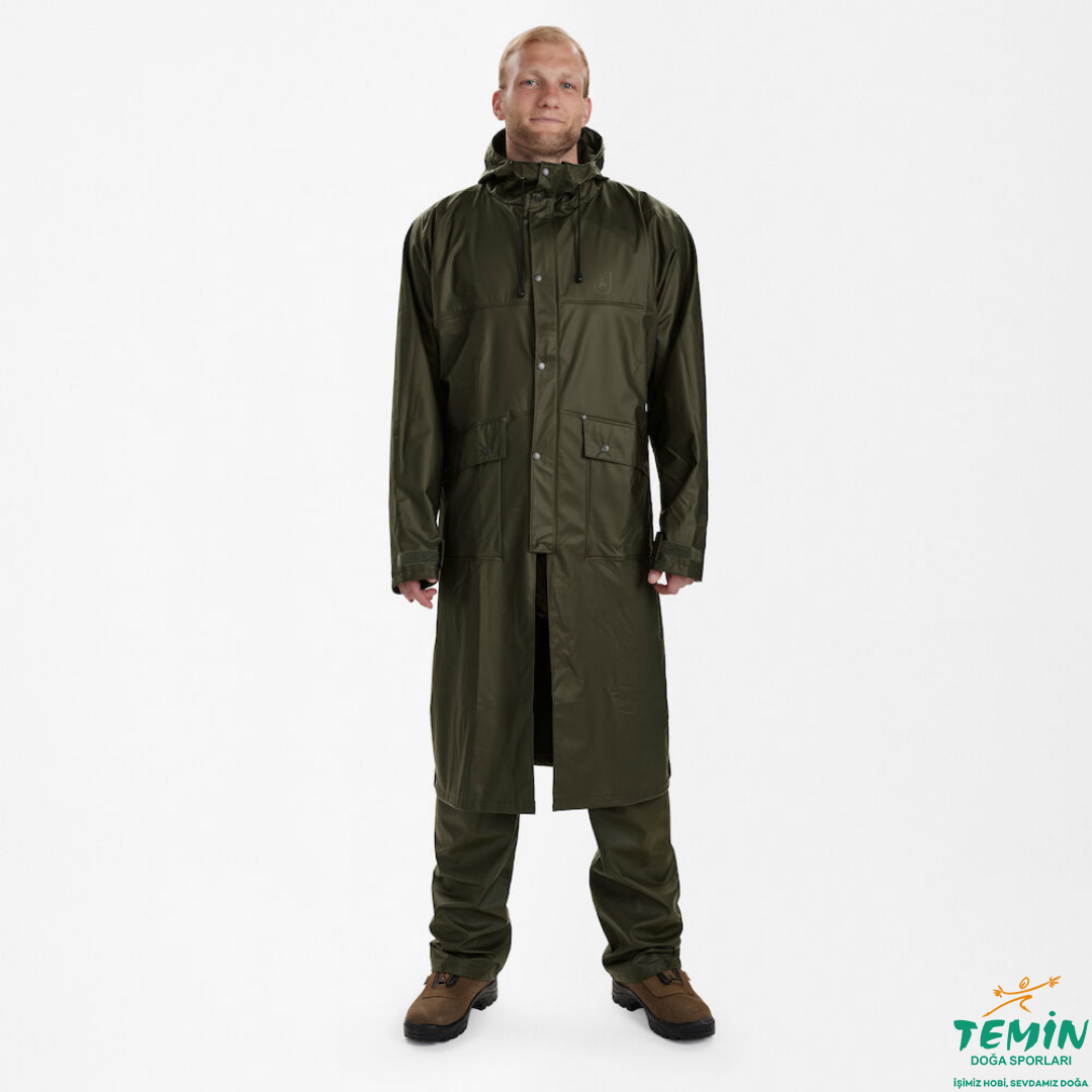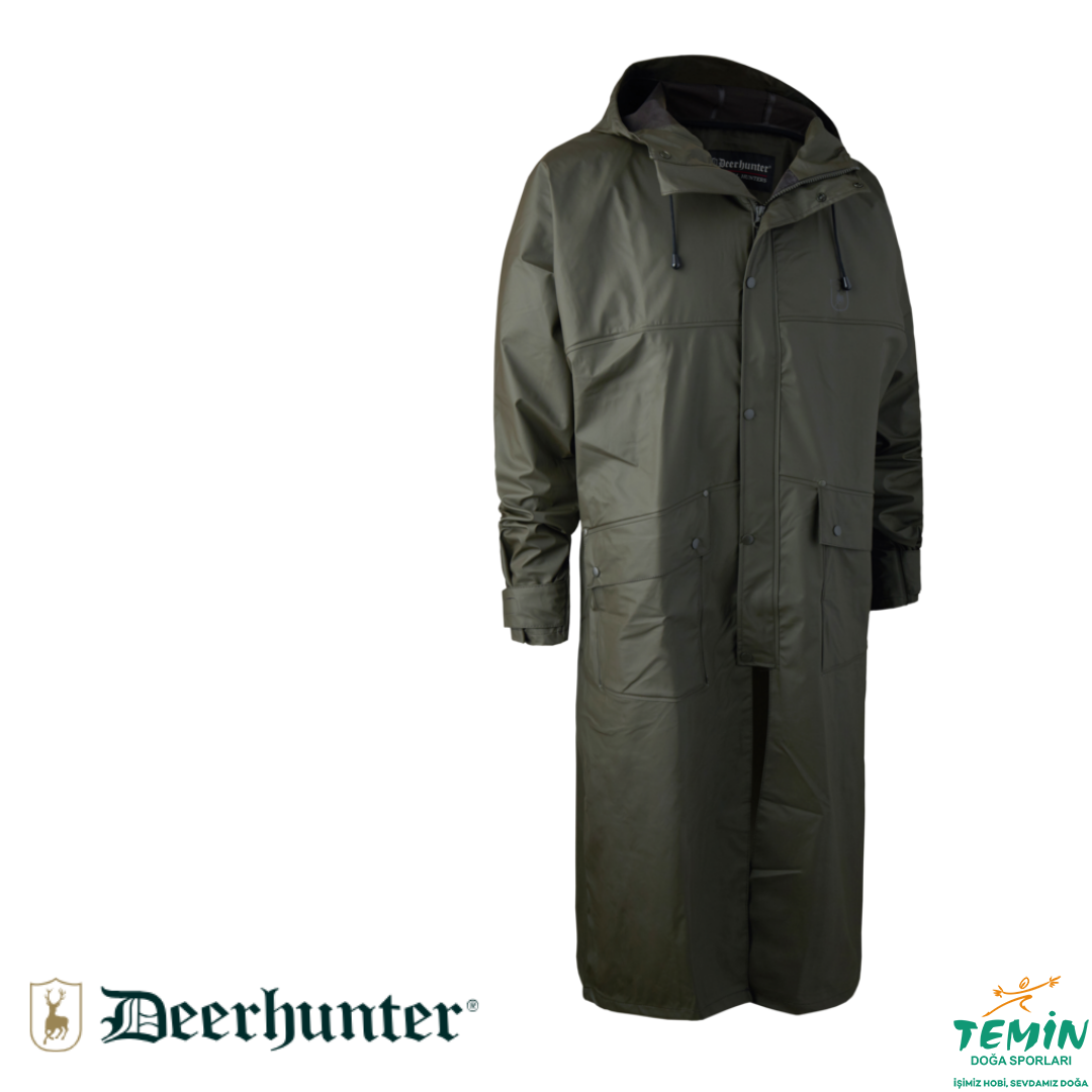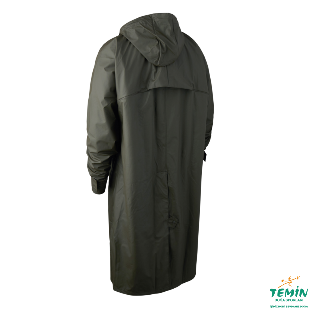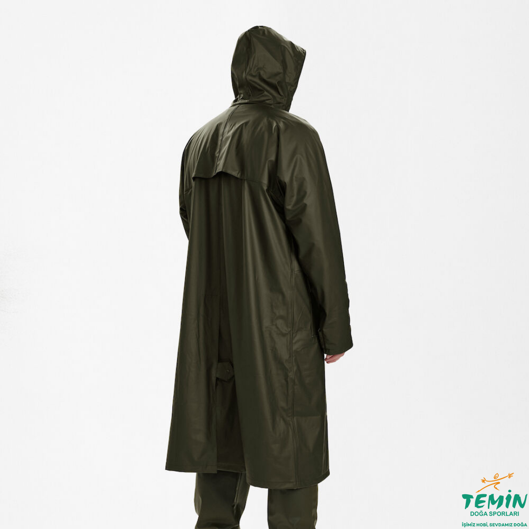 Kapşonlu ve arkada havalandırma deliği olan uzun yağmurluk %100 su geçirmez PU kaplamalıdir. Düğmeli ön cepler ve arkada ve kol altında havalandırma bulunur. Makinede yıkanabilir.