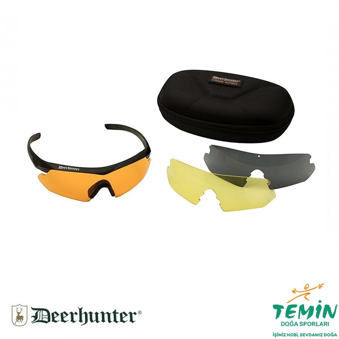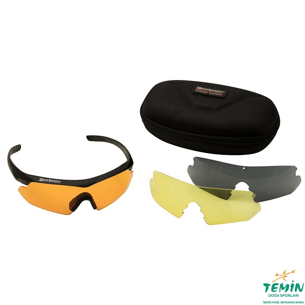 UV korumalı Deerhunter Shooting gözlük, duman–turuncu–sarı değiştirilebilir lens setiyle farklı ışık koşullarına hızlı uyum sağlar.