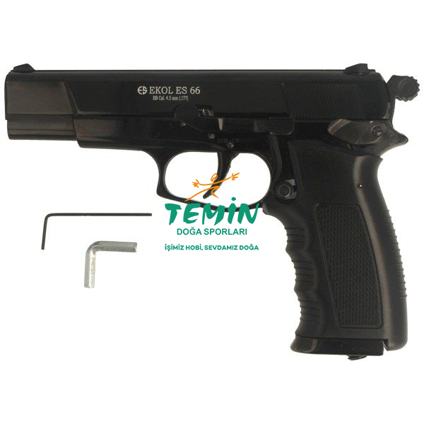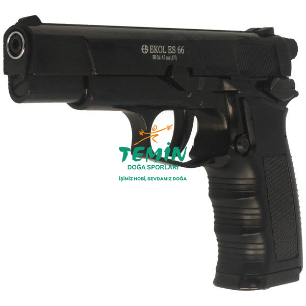 Ekol ES 66 siyah CO2 havalı tabanca, 12 gram CO2 tüp ile çalışan, 4.5 mm çelik BB saçma kullanan, sağlam gövdeli ve dengeli yapısıyla hedef ve hobi amaçlı kullanım için ideal bir modeldir.