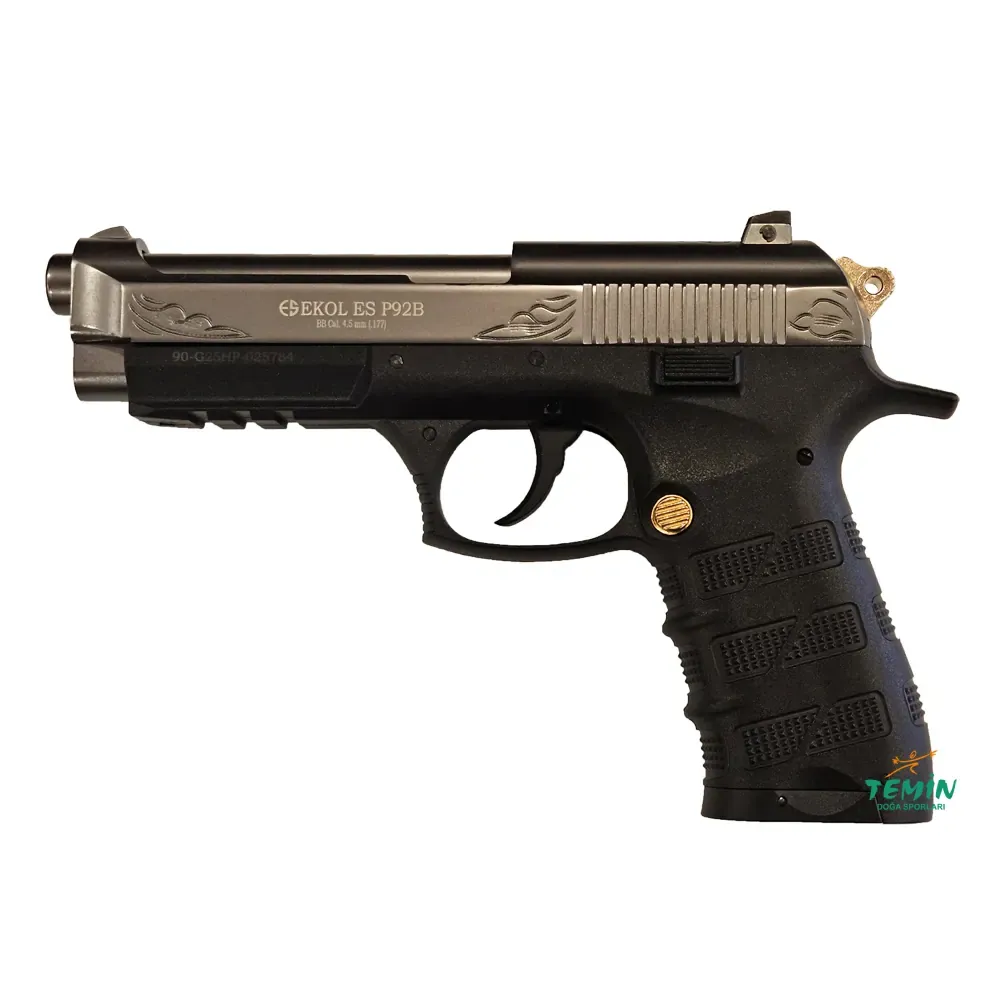 Ekol ES P92B Füme İşlemeli; blowback hareketli üst mekanizmasıyla gerçekçi tepme hissi sunan, 12 gr CO₂ ile 4.5 mm çelik bilye atan ve 14 kapasiteli şarjöre sahip yarı otomatik havalı tabancadır.