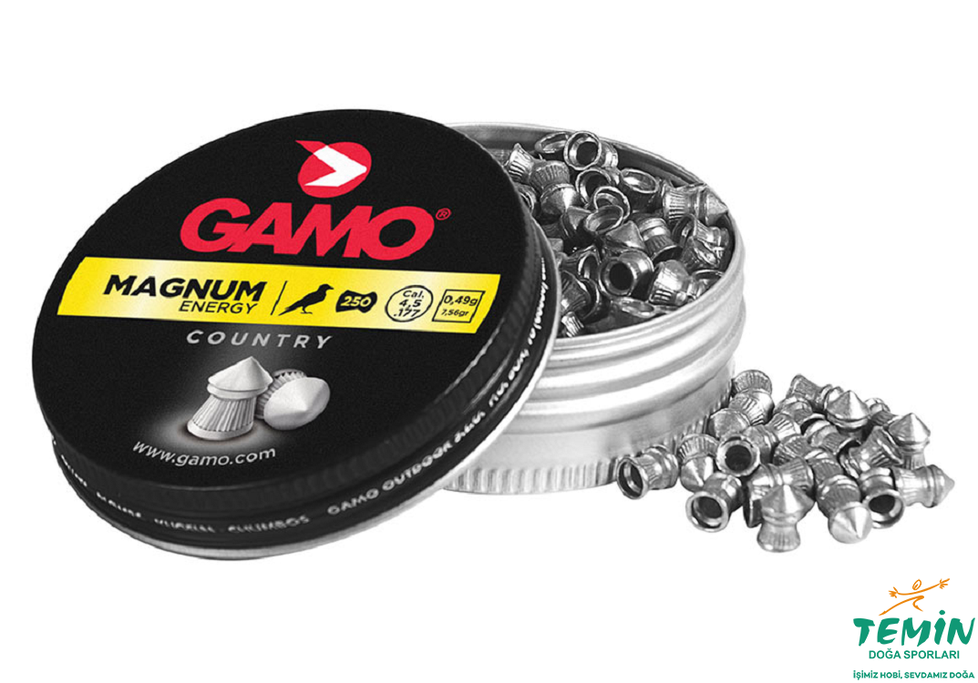 Kısa–orta menzilde “net vur, devam et”: Gamo Magnum Energy 4.5mm. Sivri uç + çift halka tasarım; 7.56 gr, 250’li metal kutu.