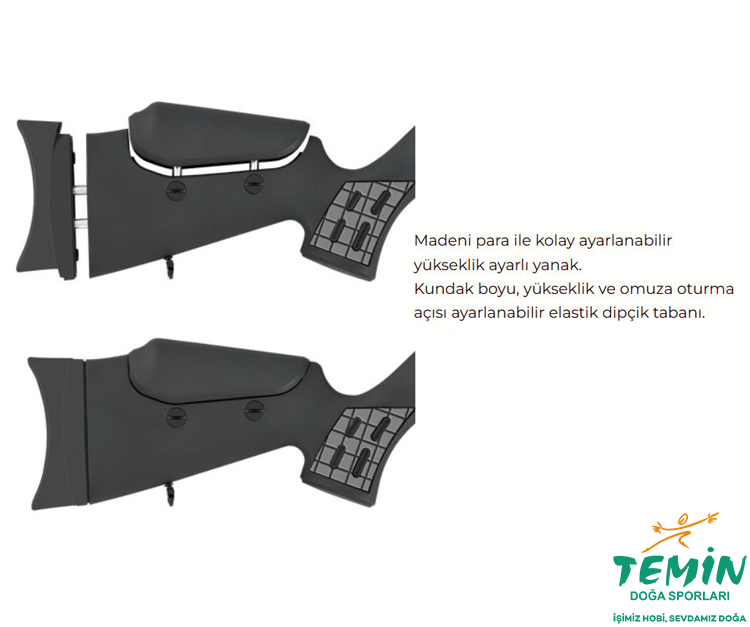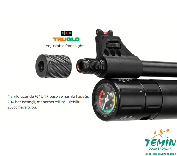 10 atışlı şarjör + mavzer tipi kurma kolu + Quattro tetik kombinasyonuyla hızlı kullanım ve kontrollü atışta fayda sağlar. 255cc tüp (200 bar), 11/22mm dürbün kanalı, 22mm picatinny, ½” UNF namlu ucu ve hediyeli çantalı set ile dolu dolu bir Elite paketi.