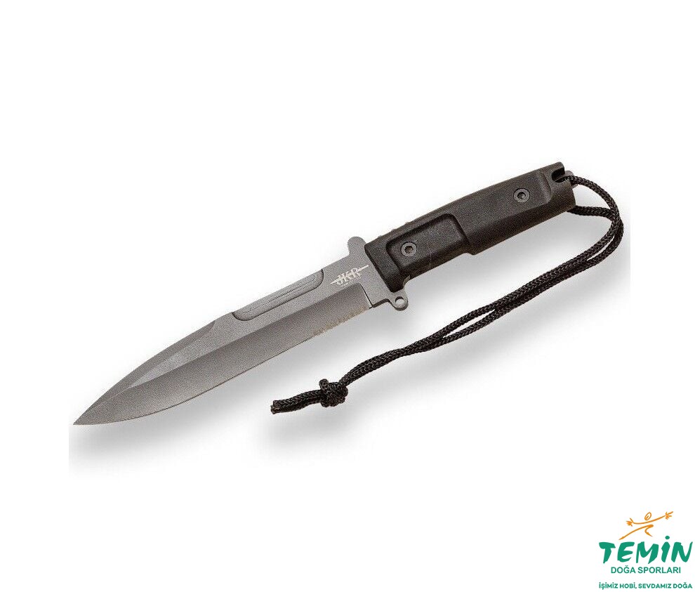 Kauçuk saplı hayatta kalma bıçağı. Titanyum namlu kaplamalı bıçak. Naylon kılıf ile birlikte verilir.