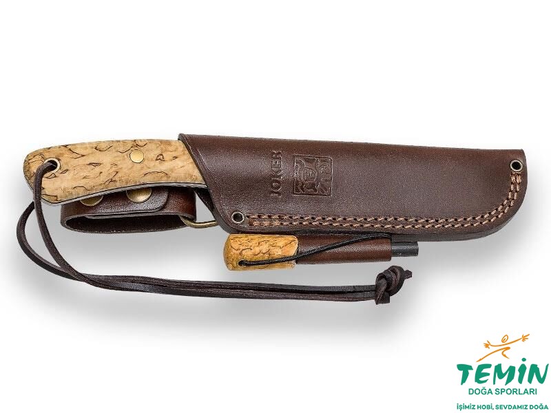 İzlediğiniz üründe, kılıfa takılabilen bir ateş başlatıcı çubuk (ferrocerium rod) ve onu sürtüp kıvılcım çıkarabileceğiniz metal plaka (striker plate) da bulunmaktadır. Kordon deliğine sahip ateş başlatıcı çubuğun (PD5) başlığı, bıçağın sap malzemesiyle aynıdır.