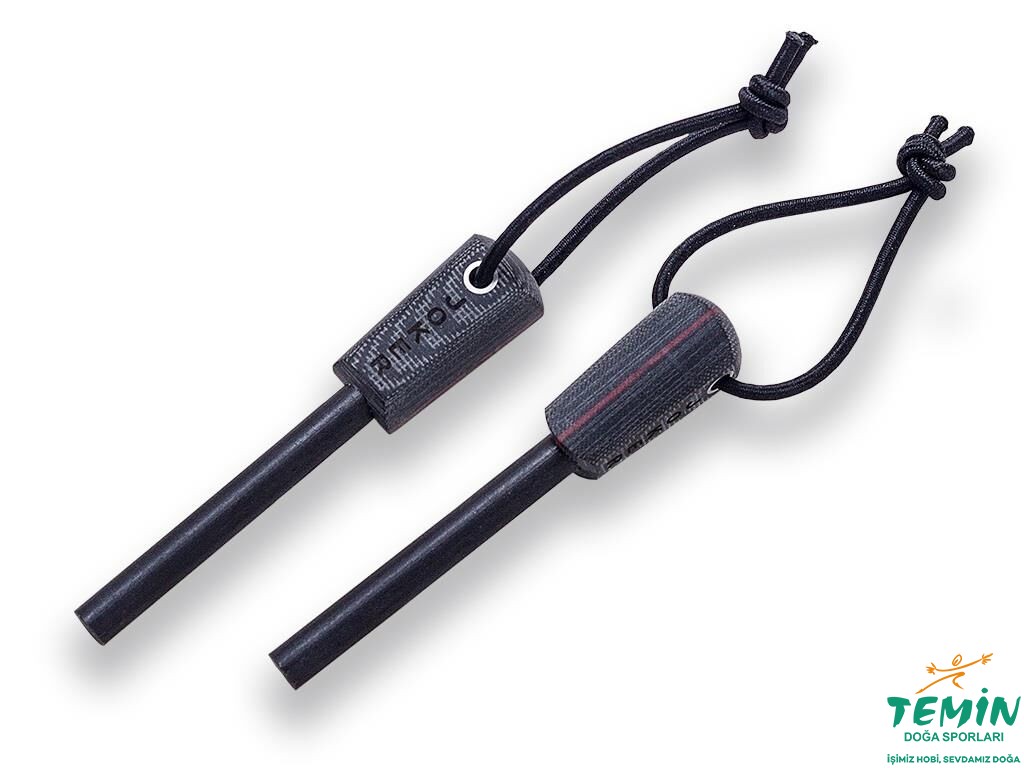 İzlediğiniz üründe, her ikisinin üzerinde de kordon deliği bulunan, kılıfa takılabilen bir ateş başlatıcı çubuk (ferrocerium rod) ve onu sürtüp kıvılcım çıkarabileceğiniz metal plaka (striker plate) bulunmaktadır. Ateş başlatıcı çubuğun (PD1) başlığı, bıçağın sap malzemesiyle aynıdır.