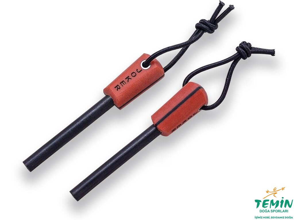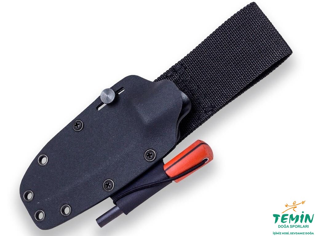 İzlediğiniz üründe, her ikisinin üzerinde de kordon deliği bulunan, kılıfa takılabilen bir ateş başlatıcı çubuk (ferrocerium rod) ve onu sürtüp kıvılcım çıkarabileceğiniz metal plaka (striker plate) bulunmaktadır. Ateş başlatıcı çubuğun (PD10) başlığı, bıçağın sap malzemesiyle aynıdır.