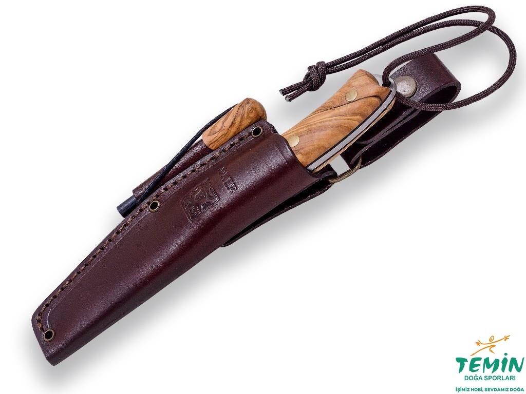 İzlediğiniz üründe, kılıfa takılabilen bir ateş başlatıcı çubuk (ferrocerium rod) ve onu sürtüp kıvılcım çıkartabileceğiniz metal plaka bulunmaktadır. Kordon deliğine sahip ateş başlatıcı çubuğun (PD4) başlığı, bıçağın sap malzemesiyle aynıdır.