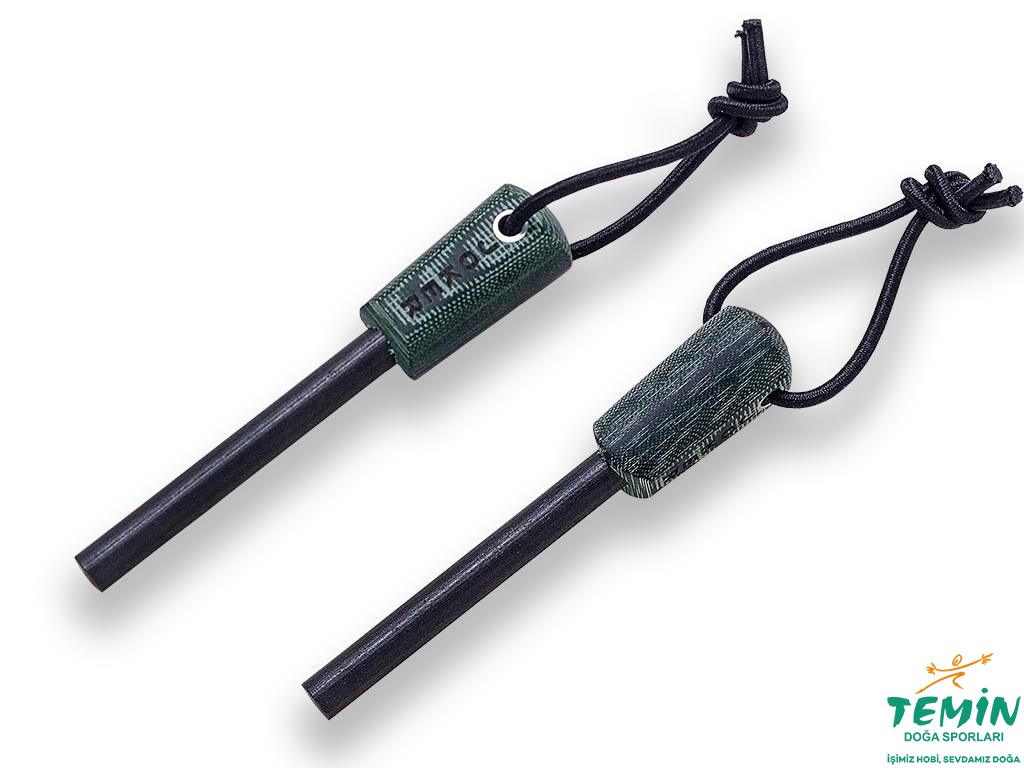 İzlediğiniz üründe, her ikisinin üzerinde de kordon deliği bulunan, kılıfa takılabilen bir ateş başlatıcı çubuk (ferrocerium rod) ve onu sürtüp kıvılcım çıkarabileceğiniz metal plaka (striker plate) bulunmaktadır. Ateş başlatıcı çubuğun (PD9) başlığı, bıçağın sap malzemesiyle aynıdır.