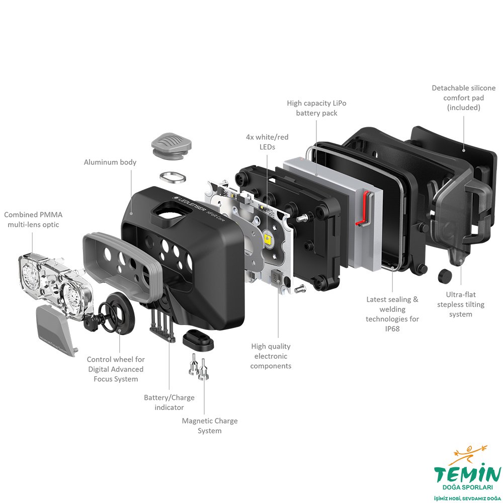 Hafif ve yüksek kaliteli bir alüminyum muhafazanın yanı sıra üç parlaklık seviyesi ve bir kırmızı ön ışık ile birlikte gelir.