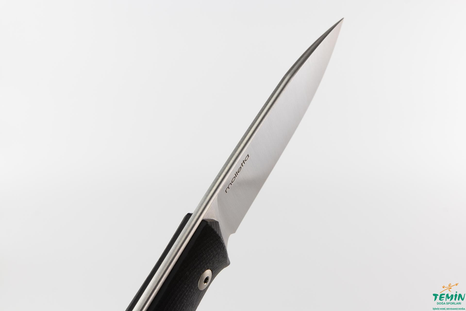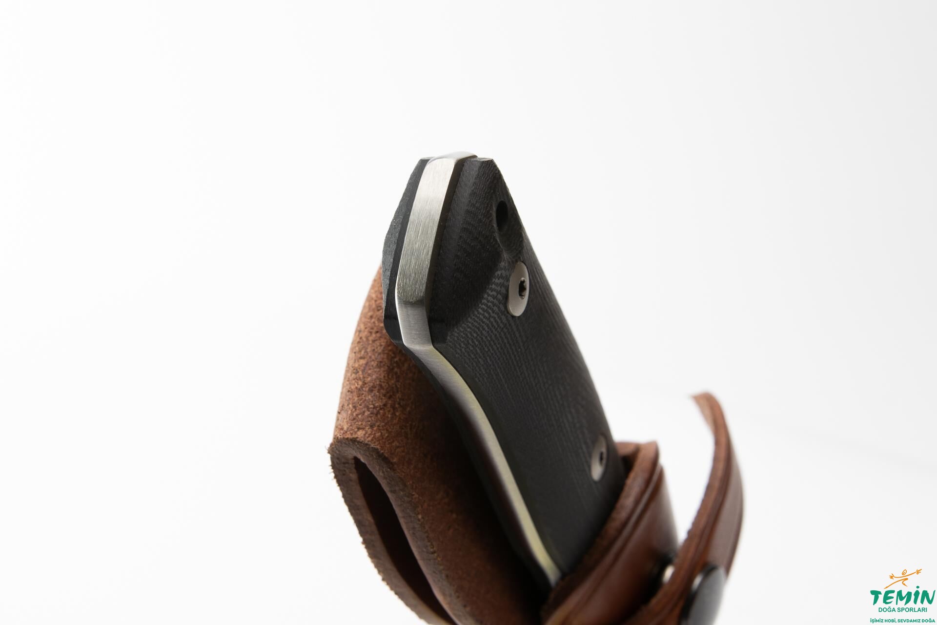 Vurup parçalama veya ateş başlatıcıya sürtme amaçlı kullanabileceğiniz (Ateş başlatıcıya sürterken bıçağı kılıftan çıkarmanız da gerekmez.) uzatılmış kuyruğa (extended tang) sahip bıçağın sap malzemesi, siyah renkli, G10’dur. Hafif, dayanıklı ve kaydırmaz özellikteki G10, bushcraft bıçaklarda sıklıkla tercih edilen bir sap malzemesidir.