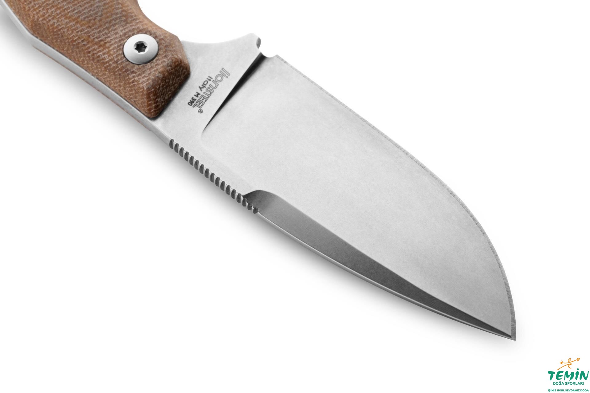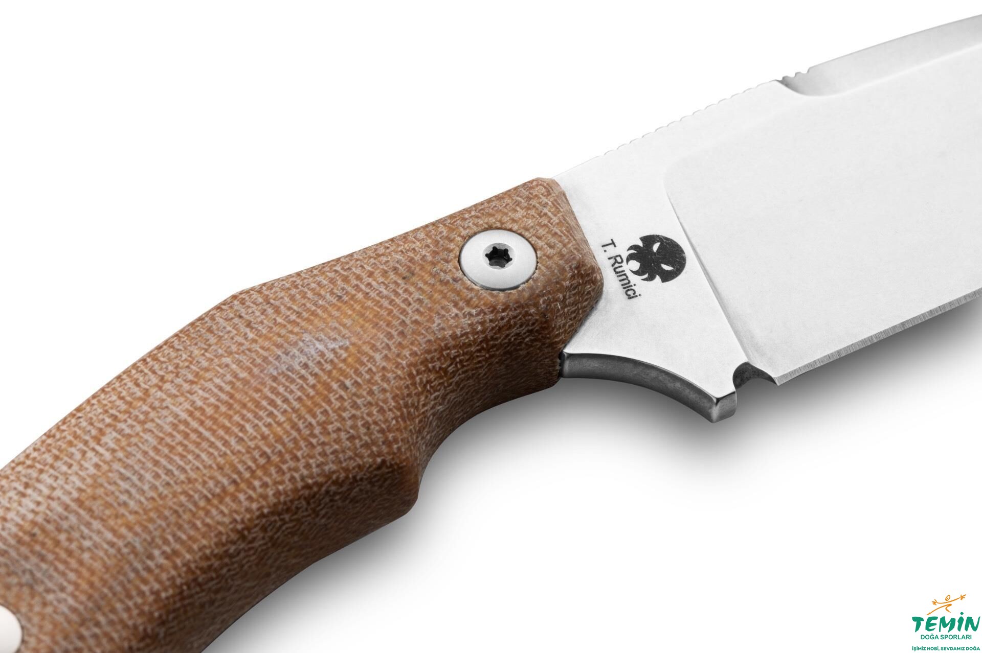 İzlediğiniz versiyonda, doğal renkte kanaviçe mikarta (natural canvas micarta) sap malzemesi kullanılmıştır. Genişçe dokulu ve yüksek yoğunluklu bu malzeme, asıl olarak sağlamlık ve rutubet başta olmak üzere çevresel koşullara karşı dayanıklılık sunmaktadır. Sap malzemesi üzerinde üç boyutlu çalışılarak rahat ve sağlam kavrama geliştirilmiştir. Sap malzemesinin yerine takılmasında cıvatalardan faydalanılmıştır.